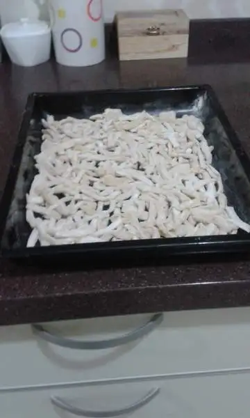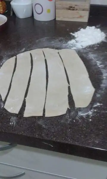 Yoğurdumuz hamuru 4 parçaya bölüyoruz,yuvarlak yada kare olarak açıyoruz,sonrada uzun kalın şeritler halinde kesiyoruz.Kullandığım bıçak tezgah üstü için,hem tezgaha zarar vermiyor hemde elimizi koruyor.