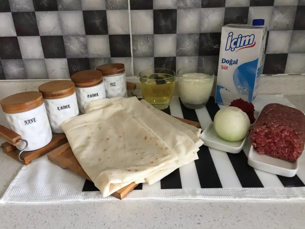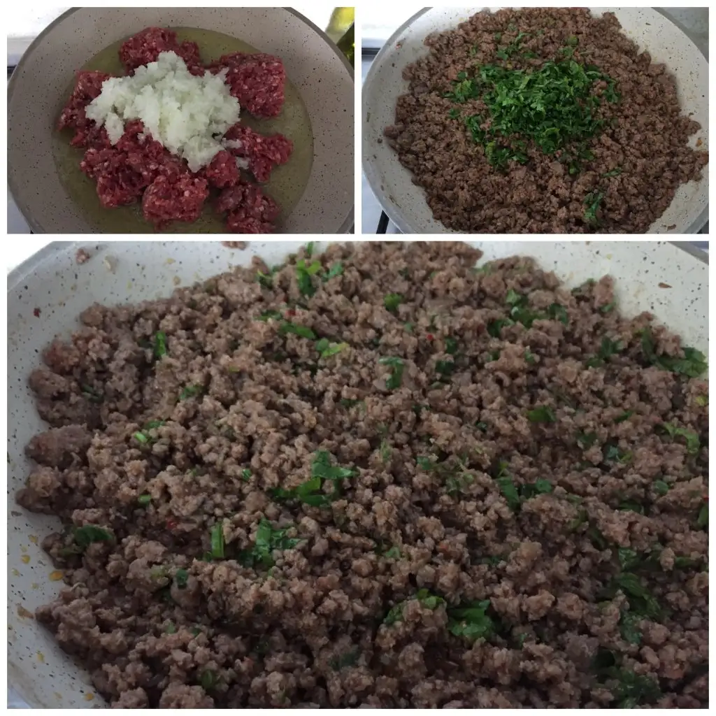 öncelikle kıymalı harcı hazırlayıp soğumaya bırakıyoruz(kıymayla soğanı yağda kavuruyoruz, salçayı tuzunu biberini ekleyip biraz daha kavurup altını kapatıyoruz, ince kıyılmış maydanozu ekleyip karıştırıyoruz)
