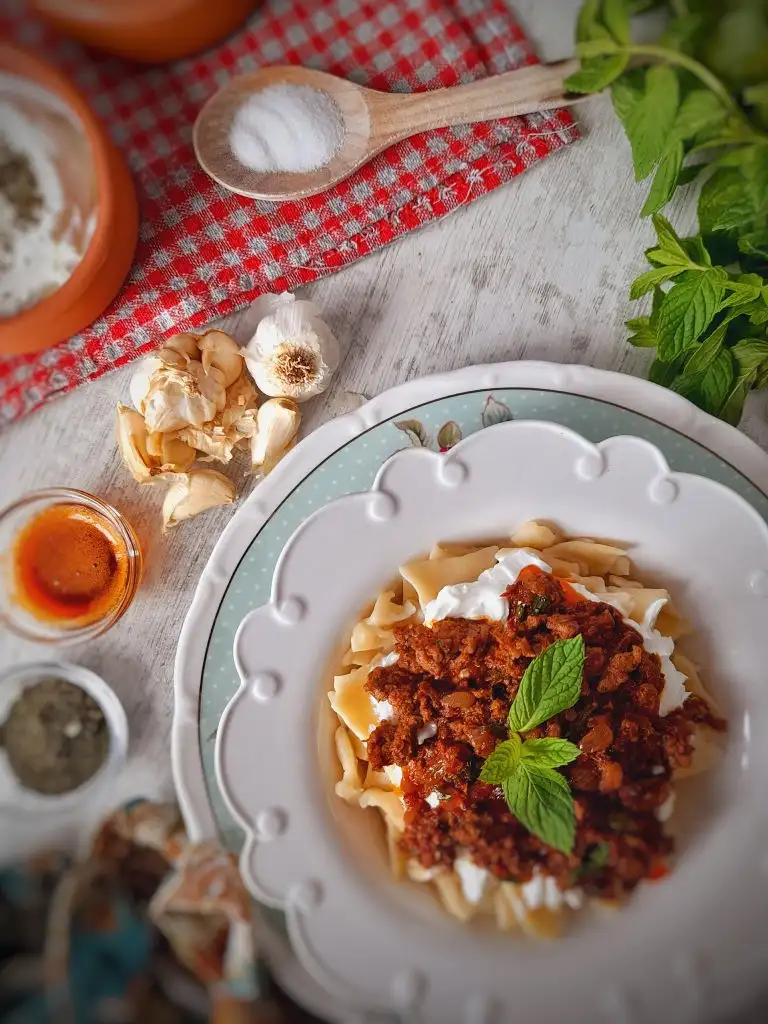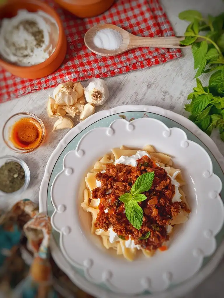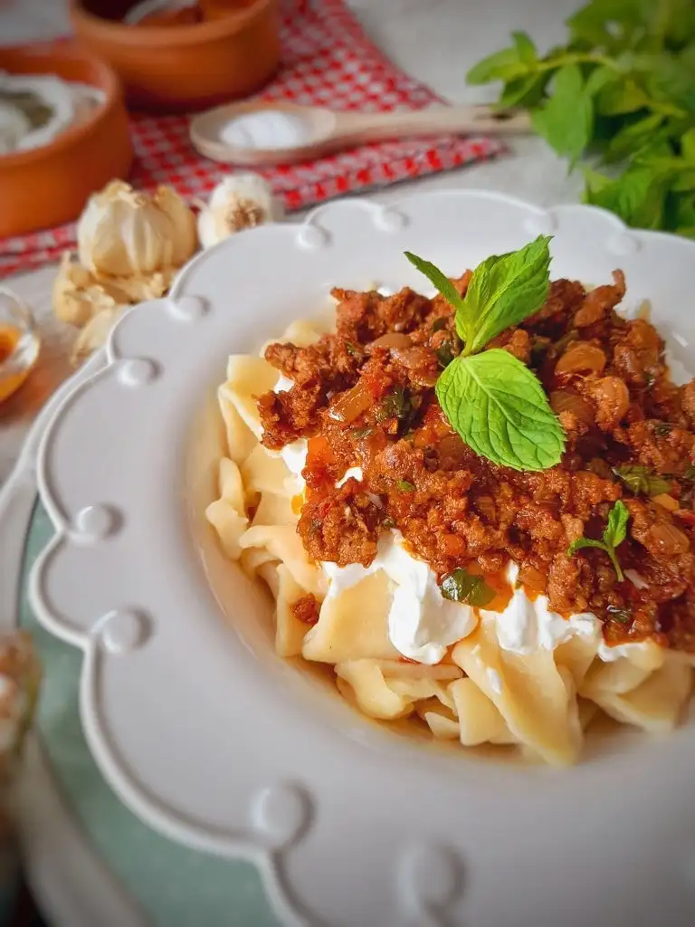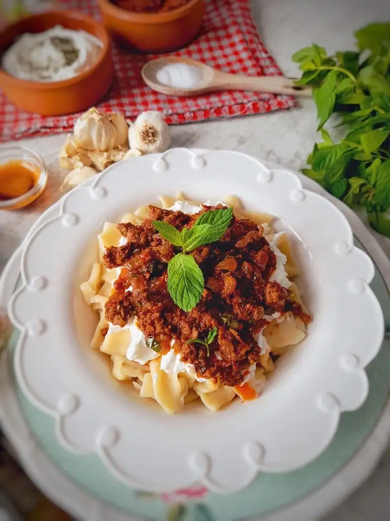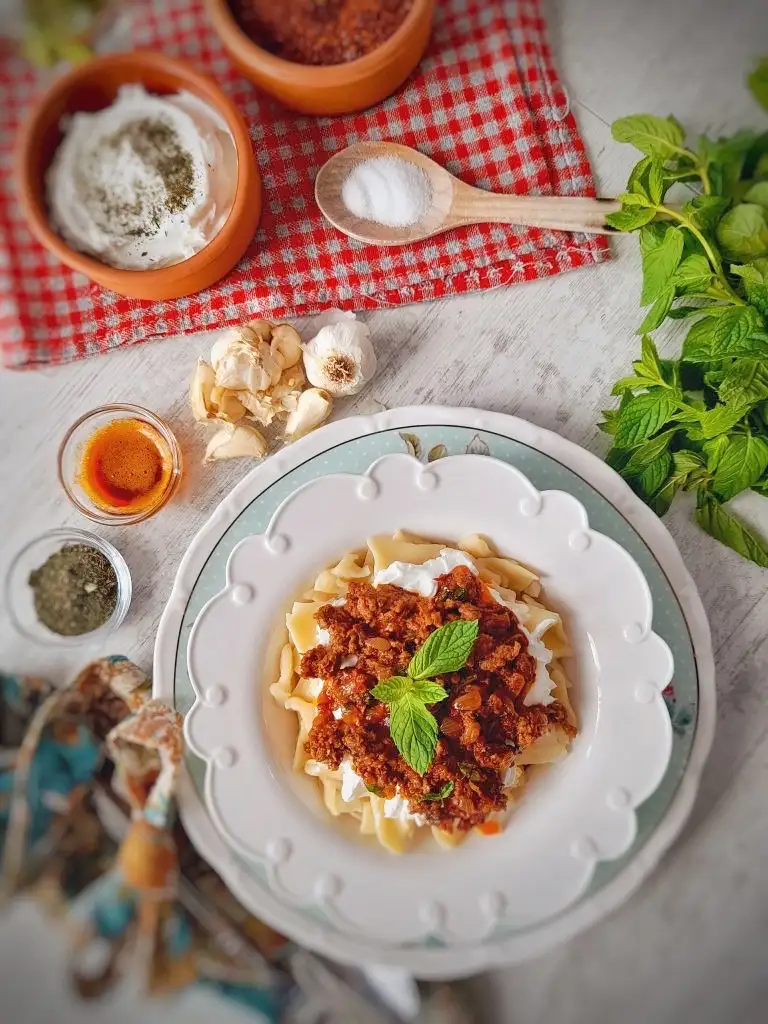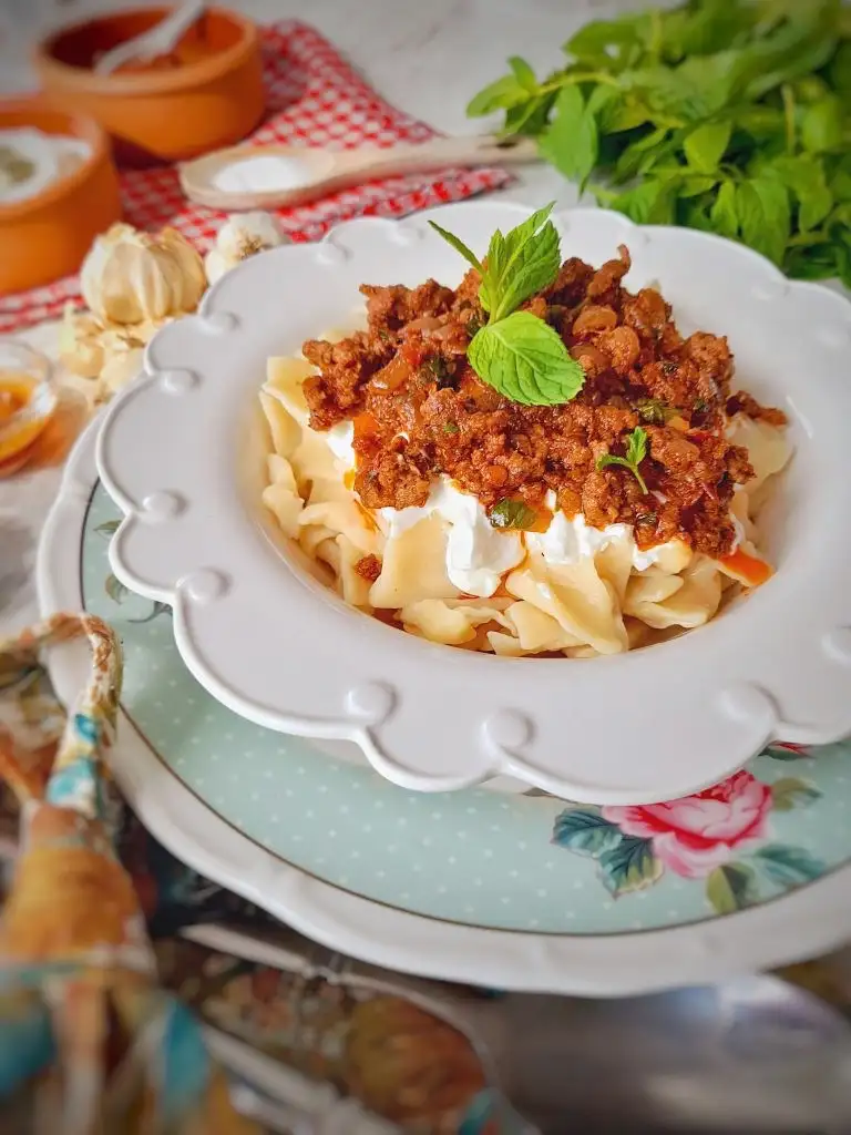 Haşlandıktan sonra tabağa alalım kızdırılmış tereyağla gezdirelim sonra kıymasinı yapalım ve sarımsaklı yoğurdumuzuda hazır edelim. Afiyet olsun(kıymasını kendime göre yaptım siz kıymasını 350 400 gramla arttırabilirsiniz )