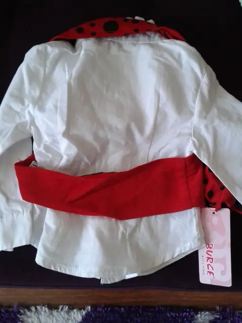 bu takım da 1 yaş için. hiç giyilmedi. etiketiyle duruyor. Yelek ve etek kadife. gömlek poplin. Fiyat 20 tl.