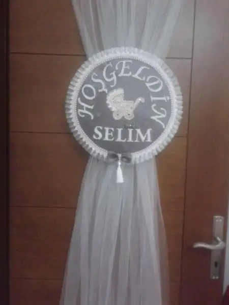 Canım bende çok süslü bir kız bebek kapı süsü var sadece doğumda bir gün kullandık yepyeni duruyor. Pembe tüllü üzerinde bebek var.