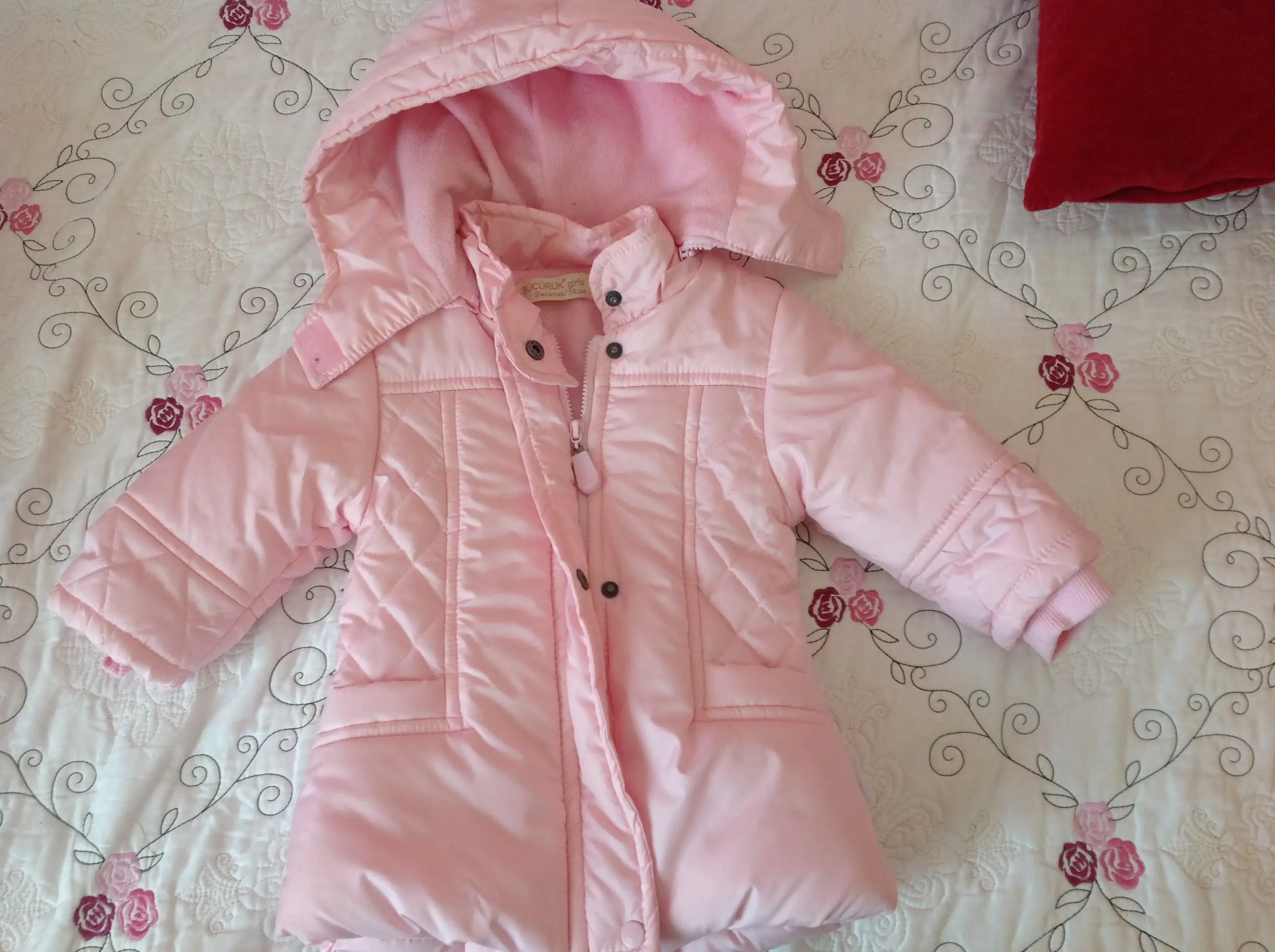 Bucuruk pembe mont ıcı yumuşak polar....9 ay 74 cm yazıyor...30 tl cok temız