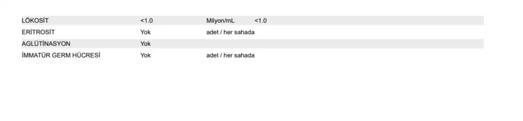 Mikroskop 5-6 yuvarlak hücre motilite %25 sayı 40milyon /mm3 miktar 5ml renk krem ph alkali kıvam hafif yoğun sizce nasıl sonuçları