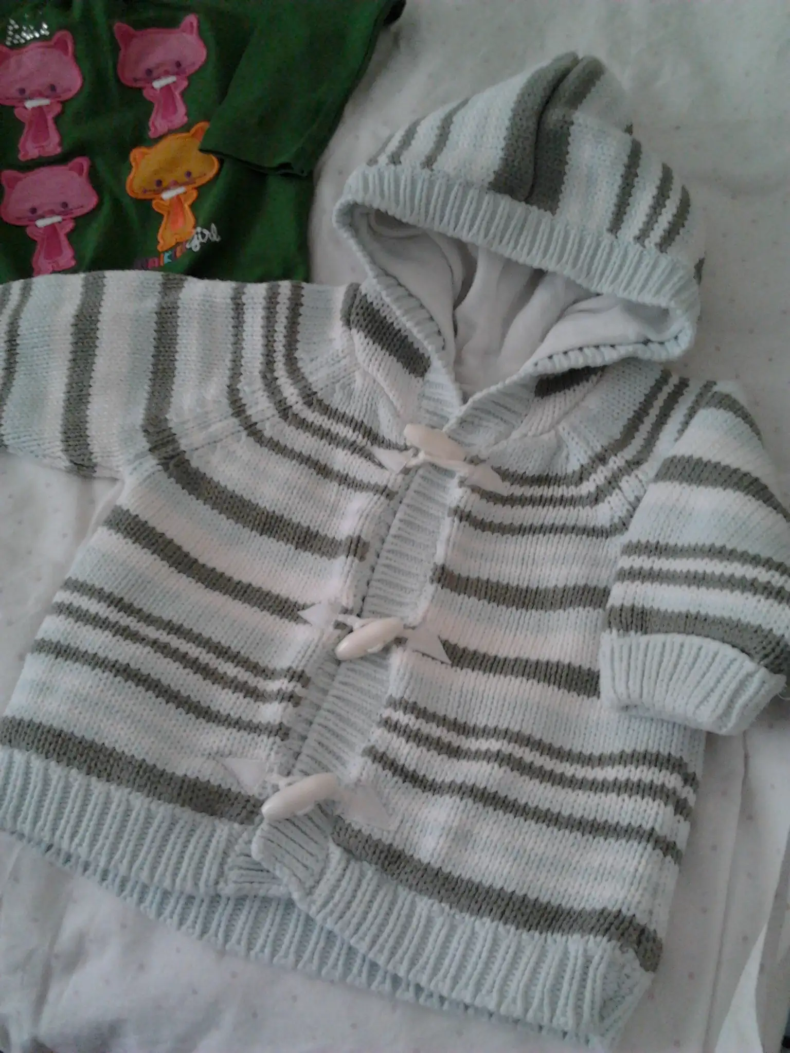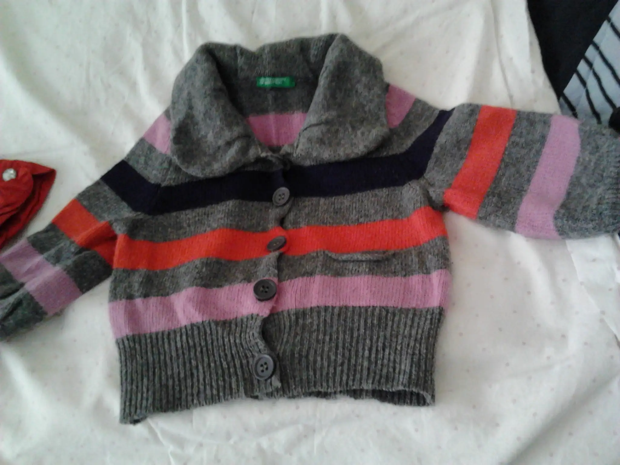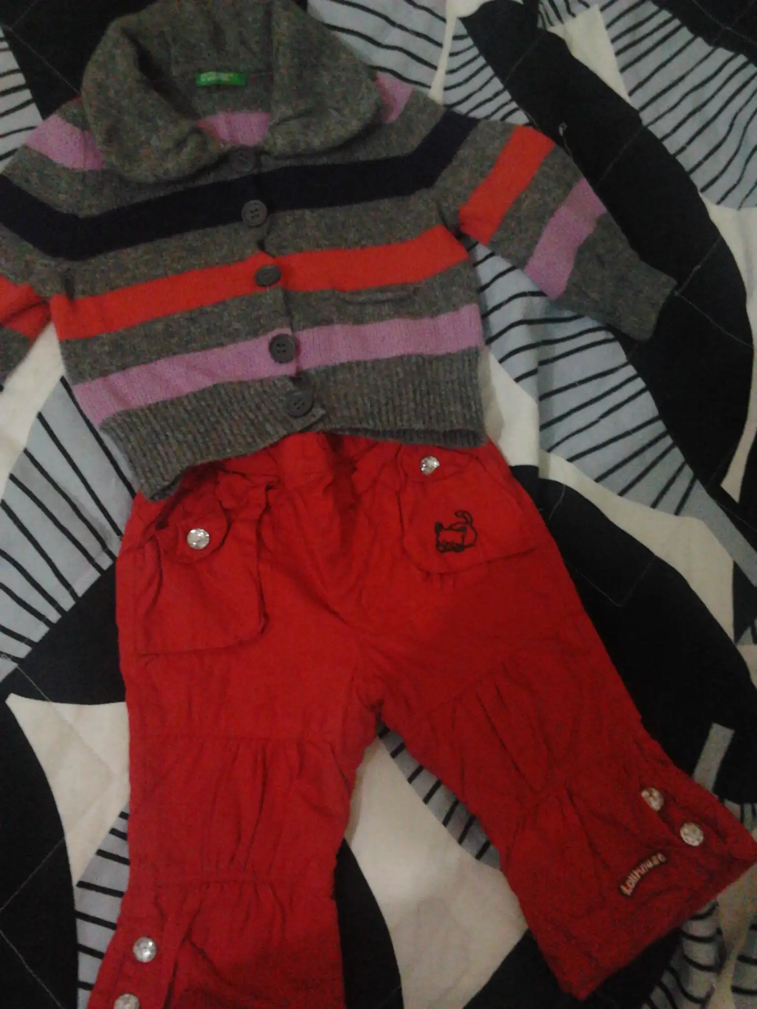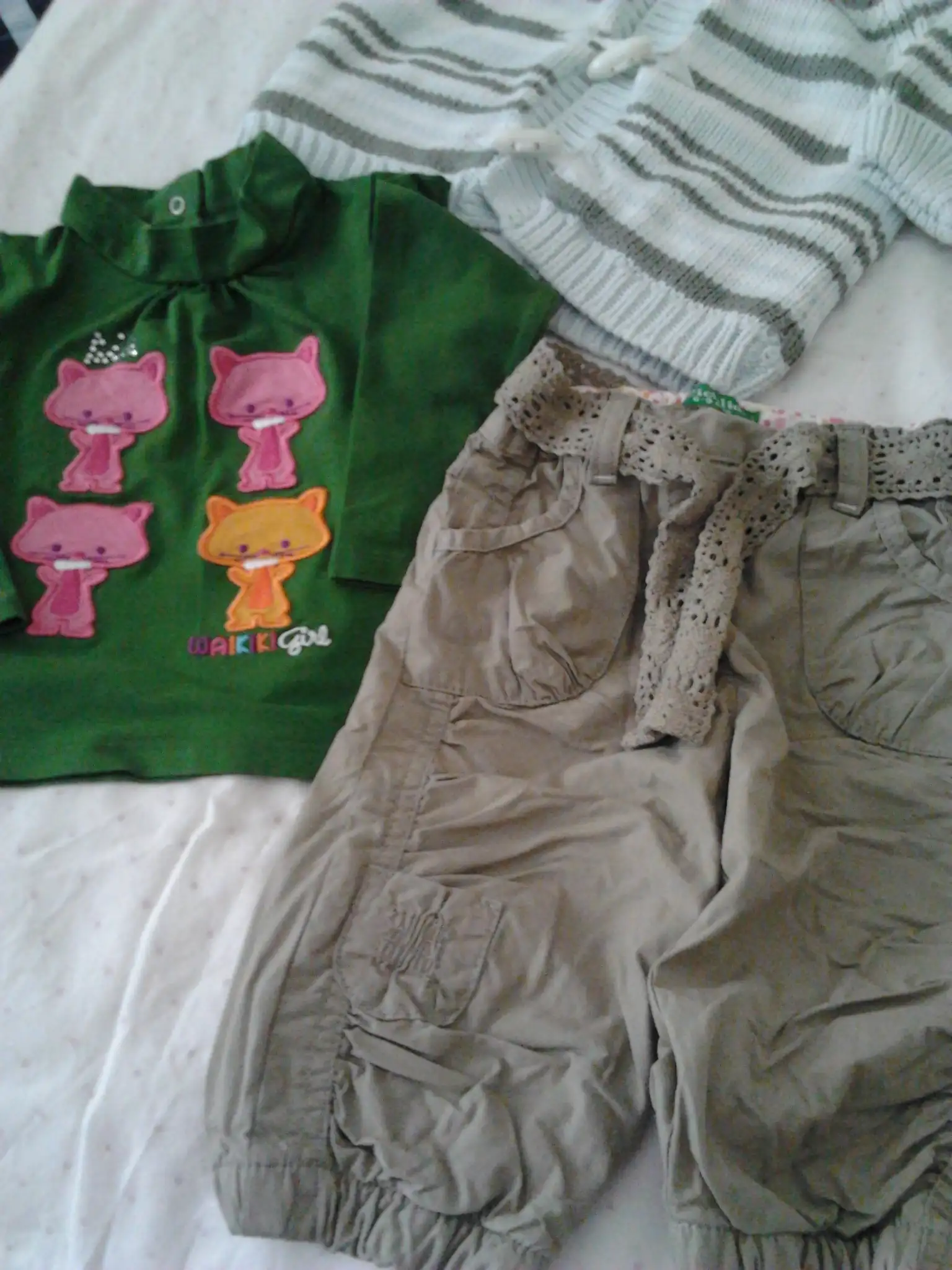 çizgili benetton hırka+kırmızı pantolon(6-9 ay)15lira...renkli düğmeli hırka cichlid marka +benotton tayt(9aylık)10lira...yeşil pantolon cichlid marka+hırkası+lcw buluzu20lira...nike 6-9aylık mont25lira...2-3yaş c&a etek +gömlek10lira