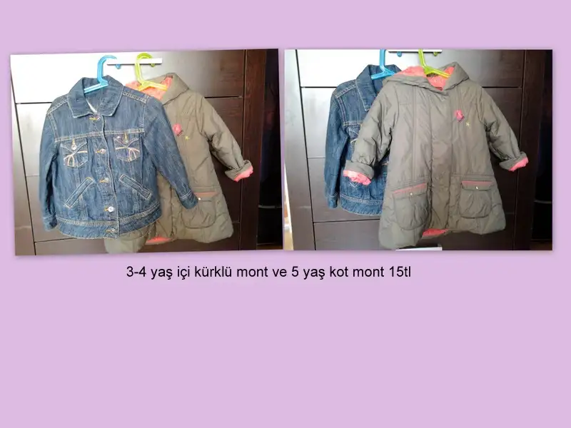 merhaba,kot mont 4-5 yaş için içi kürklü mont 3-4 yaş için..kullanım durumları:kot mont hiç giyilmedi diğeri giyildi ama kızımın bütün eşyaları gibi o da özenli bir şekilde 3 ay giyildi:)birazdan istanbula gitmek için yola çıkıcam daha önce görseydim msjınızı çekip koyardım daha yakından...çarşamba döndüğümde koyabilirim hala ilgileniyor olursanız:)