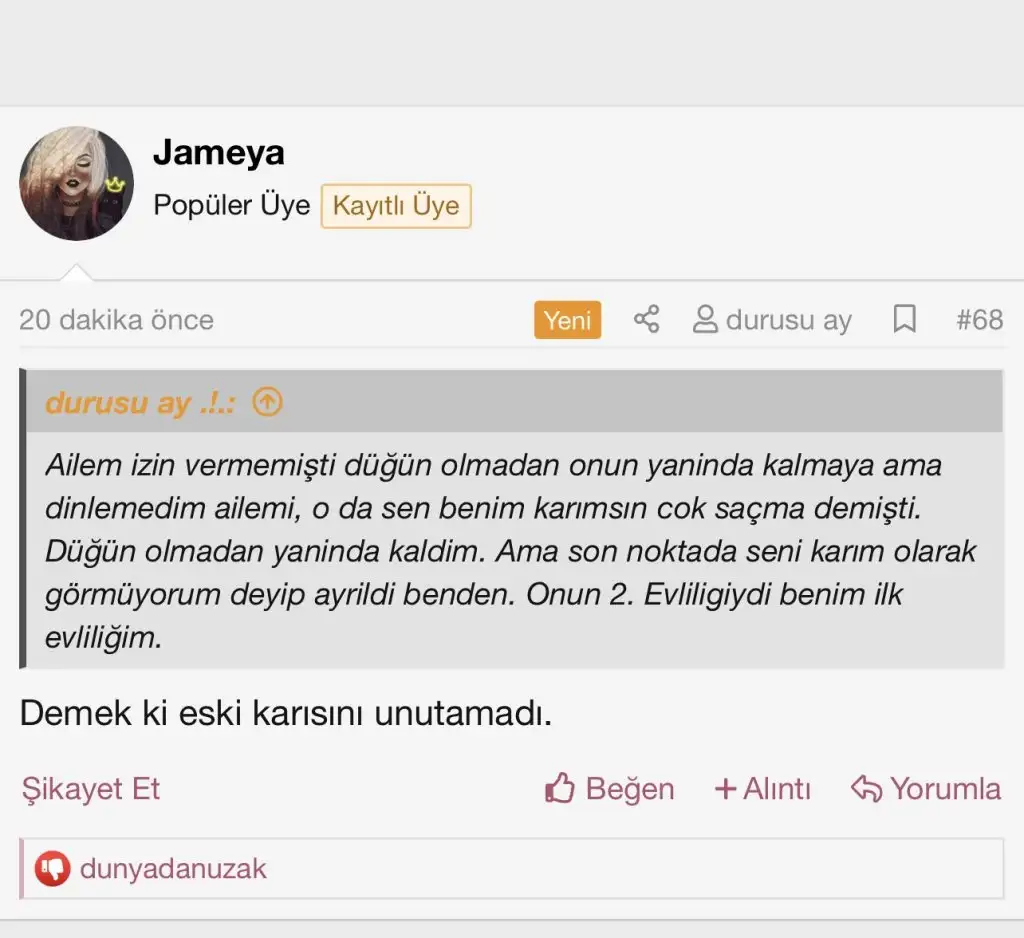 Açık açık yazayım mı? Ama Jameya dahil kimse üzerine alınmasın, pişmanlık kısmı kendimle alakalı bir şey zira, ben yılan hikayesine dönmüş şeylerden nefret ederim, hayatım elbette sadece siyah ve beyazlardan oluşmuyor griler de var ama bir kadının hayatında kocalık yapmayan adam, babalığı önemsemeyen adam varsa senelerce bu adamı dert etmek bana göre değil, kocalık yapmıyorsa gitsin, babalık yapmıyorsa da gitsin, nafakaymış, çocuğumun doğum günlerinde gelmiyormuş, gelmek yerine para gönderiyormuş, üstüne çocuğum da baba dediği adamla mutsuzsa üzerini tek seferde çizerim, baba var ama yok gibi olup evladım mutsuz olacağına, hiç olmasın daha iyi derim, şeyi de sevmem boşanmak istiyorum deyip sonra vazgeçmeleri, birkaç ayda bir boşanıyorum vazgeçtim, boşanacağım vazgeçtim konuları da beni benden alıyor, sosyal hayatımda da burada da bir-iki kere fikrimi beyan ederim sonra çekilirim.Niye pişman olasın Mune abla neticede Jameyanın burada açtığı konulardan yola çıkarak fikrini beyan ediyorsun,kendisi buraya ne kadar bilgi verdiyse biz o kadarını biliyoruz ve yorum yapıyoruz “uyduruyorsunuz” oluyor.