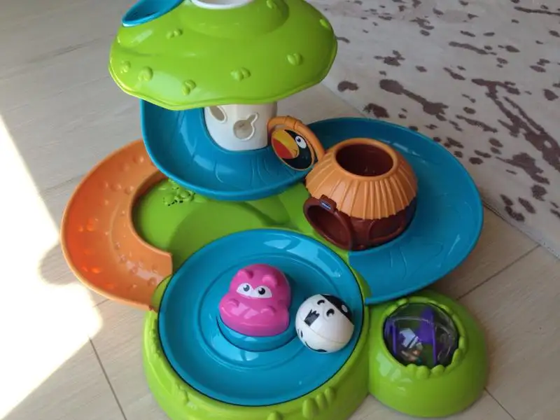 2.chicco hayal adası. Hipopotama basınca müzikler hayvan sesleri çıkıyor ve dönüyor. Tek topu var o yuzden 15 tl, ama her topla kullanılır.