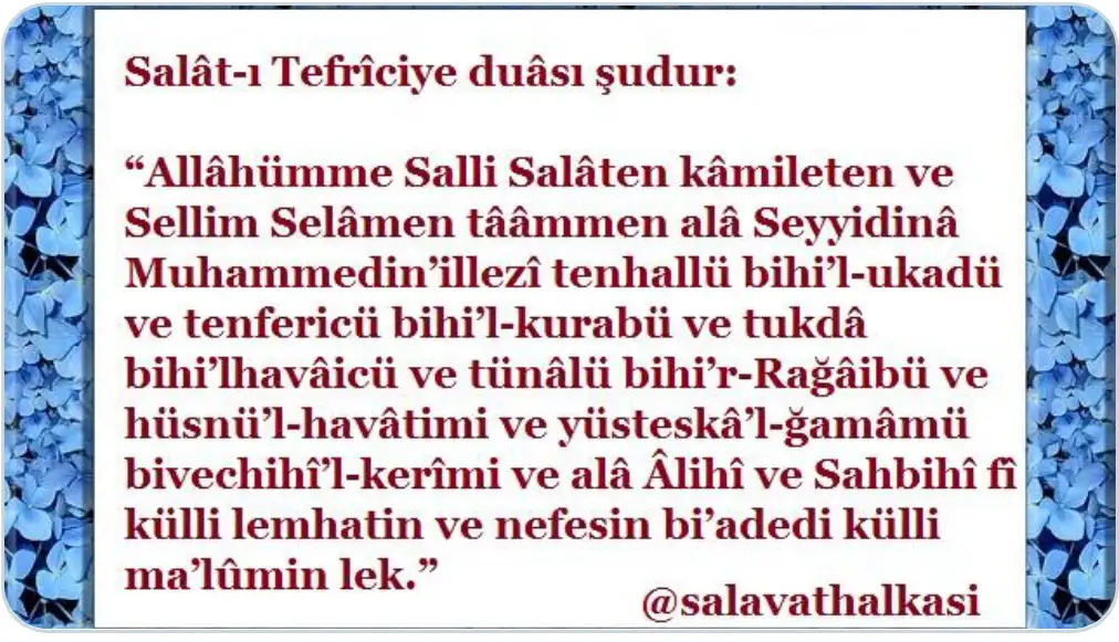 Estağfirrullah el azîym ve etûbu ileyh” diyerek tövbe istiğfar getirir. Sonra ne için okuyorsa , kalbe ona niyet eder. “Borcumdan, fakirlikten, şu muradıma erdir gibi....” Salavat-ı Tefriciyye’ye başlamadan önce bir defa