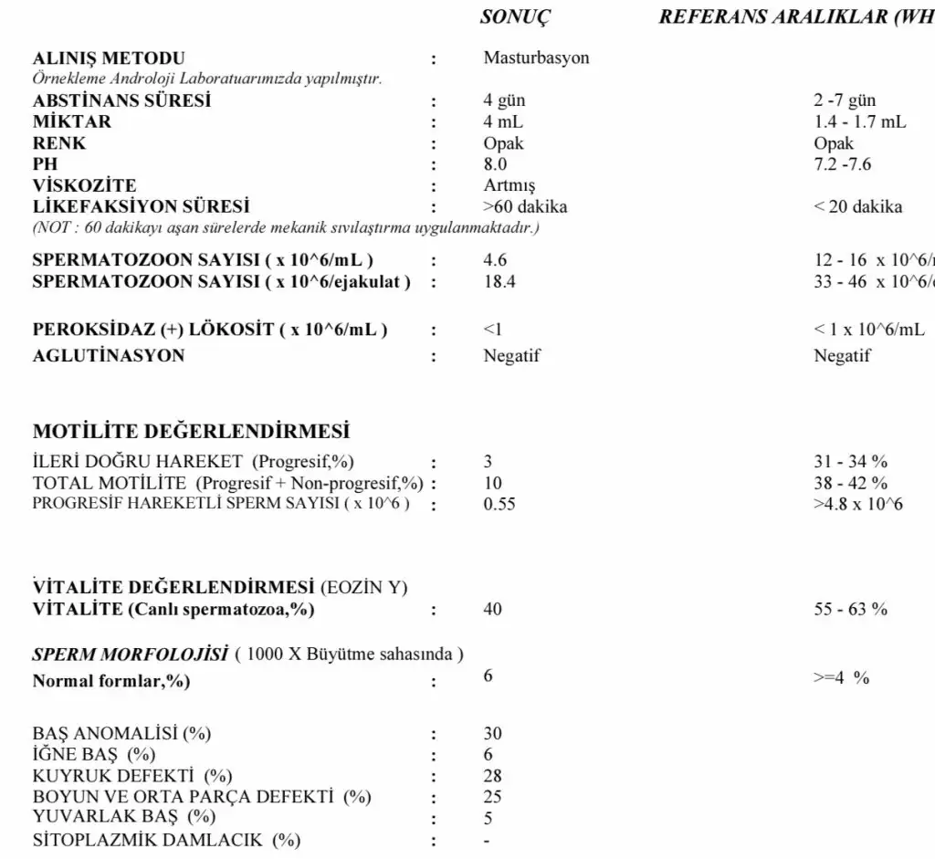 Slm kızlar bunlar da benim eşimin geçen ayki sonuçları. Bu ay daha Cuma günü yaptıracağız. Sizce bu değerler düzelebilecek değerler mi? Klomen, InfIX ve çinko hapı kullanıyor. Bunun yani sıra macun da kullanıyoruz.