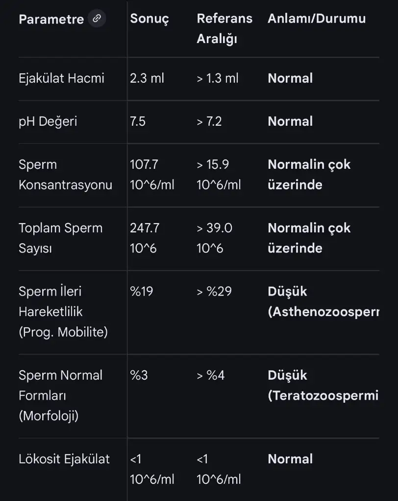 Merhaba kızlar öncelikle 3 yıllık evliyim ve evlendiğimden bu yana kilo aldığım için diyet yapmaya başladım 1 ay oldu ve kadın doğuma aylar öncesinden alınmış bir randevum vardı çünkü kilo aldığım için düzensiz reglerim olmaya başmıştı neyse yavaştan çocuk düşünmeye başladık ama önceliğim kilo vermekti bizde hazırlıklı olalım diye kontrol olmak istedik bende bir şey çıkmadı sadece hormonlarıma bakılacak 3 ay sonra eşimin de test vermesini istedim ve sonuçları cuma günü aldık bilgisi olan varsa anlatabilir mi doğal yoldan hiç mi şansımız yok bu zamana kadar hep korunduk o yüzden bilmiyorum tecrübeli kişiler lütfen benimle paylaşın
