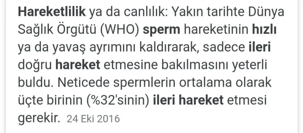 Hadi ya öyle miCanım senle daha önce de konuşmuştuk doktor bize ileri hızlı ve ileri yavaş toplamı önemli dedi. Şöyle söyleyeyim bulunduğum ilin en iyi doktorlarından biri bizim ileri hızlı 5 ileri yavaş 35 ben şey dedim ileri hızlı çok düşük xiye önemli değil dedi. Toplamı yüzde 40 dedi 32 yeterli dedi. Burda baktığım iyi sperm değerlerinden dedi
