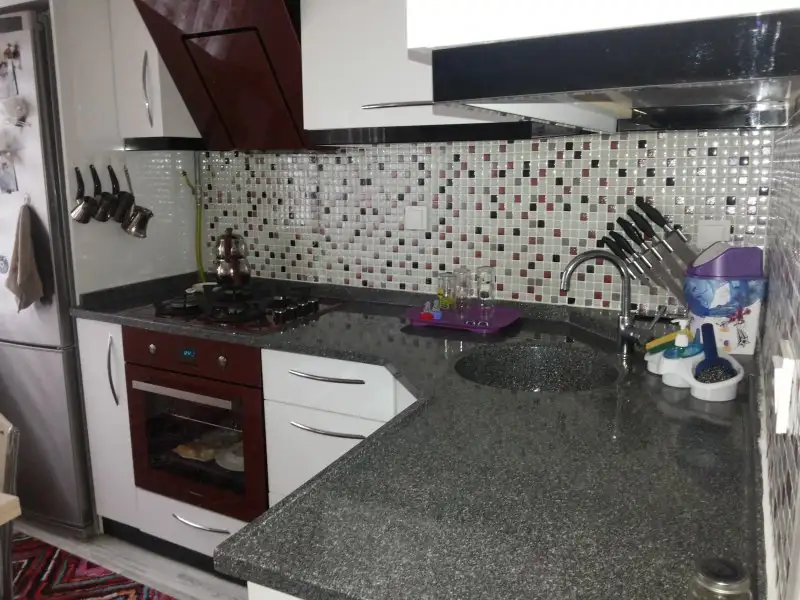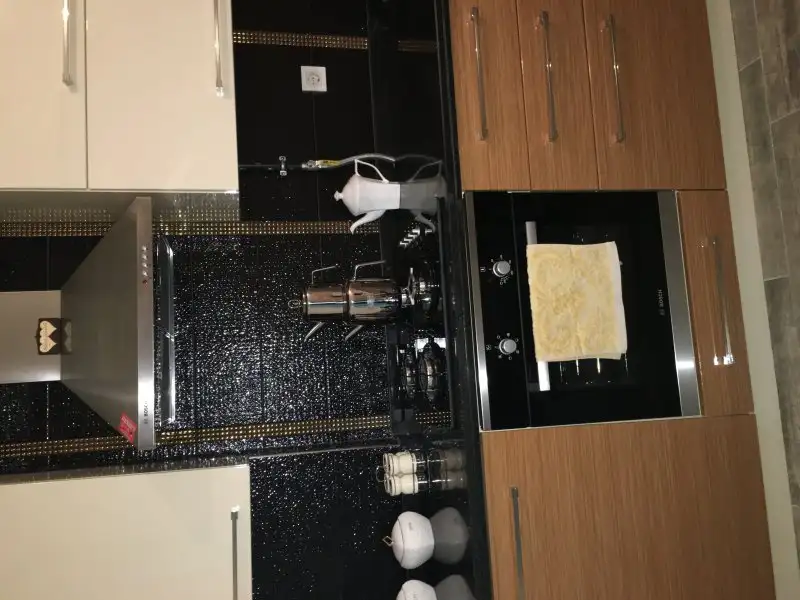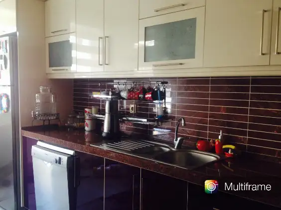 tezgah üzerinde çaycı, tost makinesi,bıçak seti, yağlık/sirkelik, bardak askılığında ise nescafe fincanları asılı bir de kahve,şeker ve tuzun bulunduğu 3tane baharatlık bulunuyor.