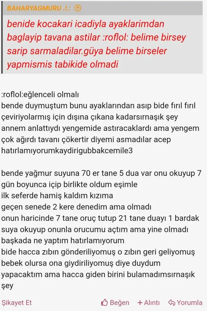 Bi de yazmış ki fırıl fırıl çeviriyorlarmış, yengemi de asacaklarmış tavanı çökertir diye asmamışlarBeyne kan hücumundan ölecekmiş kadın oha.