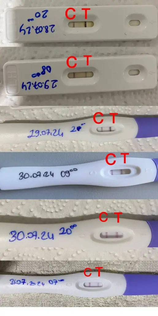 Herkese merhaba arkadaşlar. Bende 3 yıllık evliyim 1 buçuk yıldır çocuk istiyoruz ama olmadı. son 6-7 aydır tedaviler ile devam ediyoruz. ilk olarak nisan ayında klomene başladım , ovitrelle iğne vuruldum ama gebelik olmadı. sonraki ay tekrar klomen başladık ovitrelle iğne vuruldum yine gebelik oluşmadı regl oldum. Reglden sonra tekrar tedavi için kontrole gittiğimde doktorum yumurtamın 30mm ulaştığını ama çatlamadığını, bunun kiste dönüştüğünü söyledi. İlişkiye ve tedaviye 2 ay ara verdik kist içn doğum kontrol hapı ve destek takviye kullandım 2 ay. 2. ayım bittikten sonra tekrar kontorole gittim kistim kaybolmuş doktor bu kez femara hap önerdi onu kullandım 5 gün , günde 2 kez. reglin 12. günü kontrole gittim sağda 2 adet 21mm ve 22mm yumurta solda 1 tane 20 mm yumurtam geliştiğini söyledi. Çoğul gebelik riski olduğunu istersem 2 ay daha ara verebileceğimi söyledi istersen çatlatırız çoğul gebelik istersen dedi. Ben kabul ettim. ovitrelle vuruldum 25 temmuzda reglin 12. günü. bugün iğneyi vurduktan sonra 6.günüm ama yumurtam çatladı mı anlamıyorum. ovülasyon testi yapıyorum 3 gündür çift çizgi bi koyu bi silik çatladı mı ne oldu bakabilir misniz? hafif pcoss um var bu arada ama hormonlarım iyi reglm düzenli.