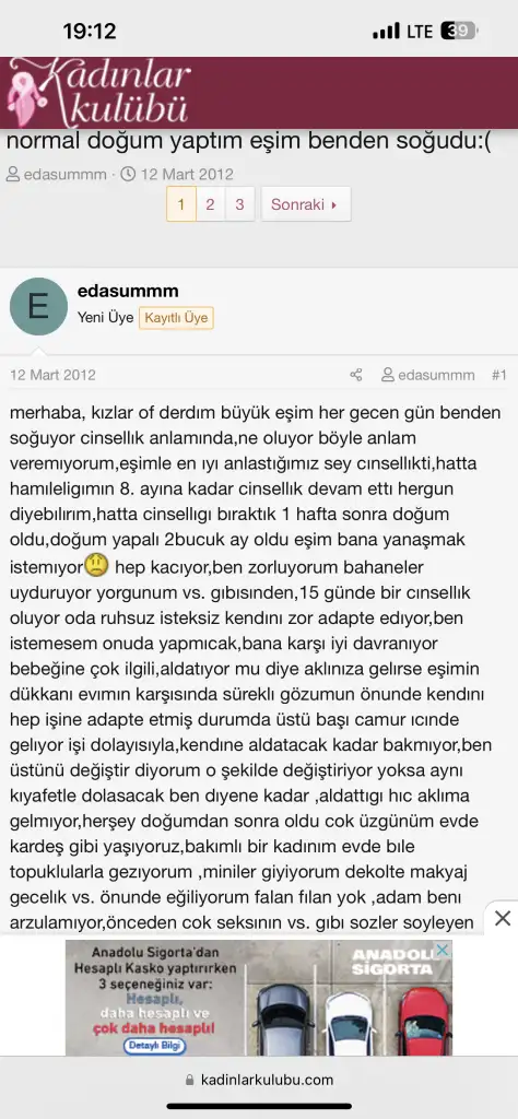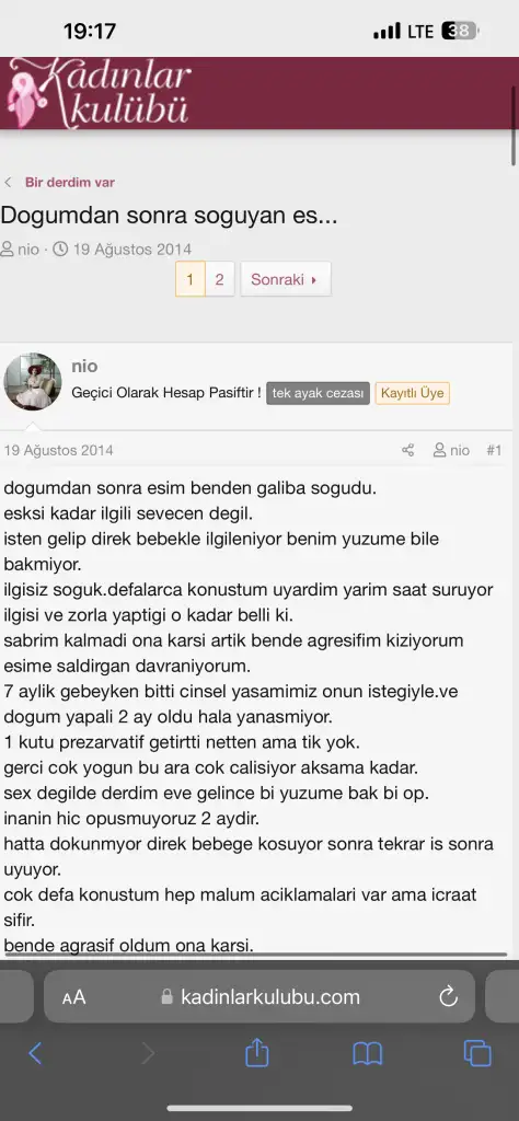Lutfen kirici yorum yapmayin psikolojim hiç iyi değil ne yapacağı bilmiyorum son çare buraya yazıp alacağım tavsiyeler iyi gelir diye düşünmekteyim. 5 gün önce sevisme öncesi eşim gaz çıkardı bende rahatsiz olup dönüp yattım. O an öyle birsey yapılmaz bi saygı olur. Neyse benin dönüp yatmış olmama kırılmış olmalı ki o gün jic konuşmadı benimle. Aksam olunca yanına gidip 'bazen birsyler olabilir ama uzatmadan konuşulup çözülmeli' dedim. Sonuçta cocuk değiliz küsmek konuşmamak nedir! Neyse kendisi konuşmak istemiyorum diyerek tavır gösterdi. Akşam uyurken yorganı çekti vermedi bana başka yorgan almamı söyledi. Ertesi gün işten gelince yemek yiyecekmisin diye sordum hayir! Dedi. Ve o günden beri 5. Gün oluyor bugün hala konuşmuyor benle tabi bende asla konuşmuyorum konuşmak istemiyorum diyen kendisiydi o yüzden kendi haline bıraktım. Ve 2 gün boyunca yaptığım yemekleri yemedi. Bende artık kendisine yemek hazırlamıyorum. Eşim normalde çocuğuna bakam ilgilenen evine herseyini alan maddi imkanı her türlü sağlayan birisi. Fakat asla sosyal bir yaşantımız yok hep çalışır kendisi neyse diğer detaylara girmek istemiyorum. Bu şekilde yapması beni soğuttu resmen gün geçtikçe gelip özür dilememesi. Sen benimle konuşmak istedin ben seni tersledim özür dilerim dememesi kalbimi çok kırdı bu kadar büyütülecek birsey asla yoktu. Her neyse yorum almak istiyorum sadece. Lütfen kırıcı yorum yapmayin
