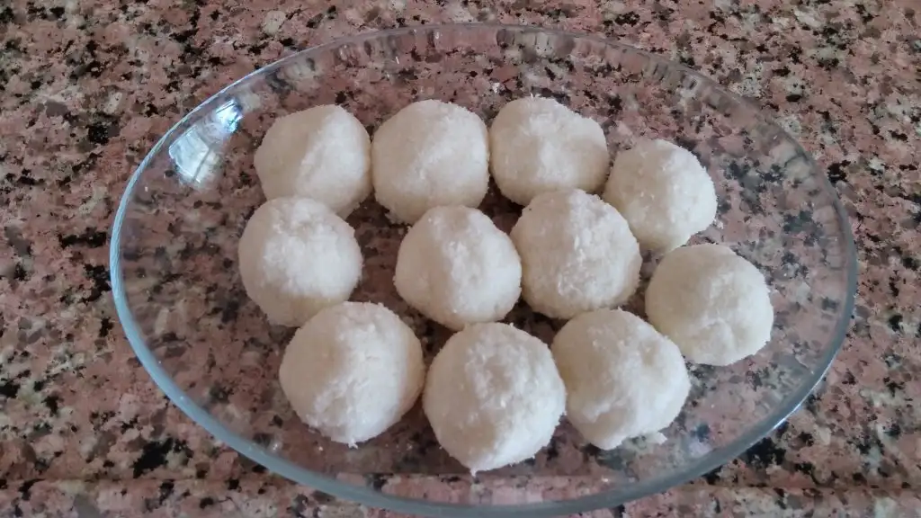 hindistan cevizi ve pudra şekerini de ekleyip yoğuruyoruz.bir kaba su koyup elimizi ıslatarak bu karışımdan yuvarlak toplar yapıyoruz.