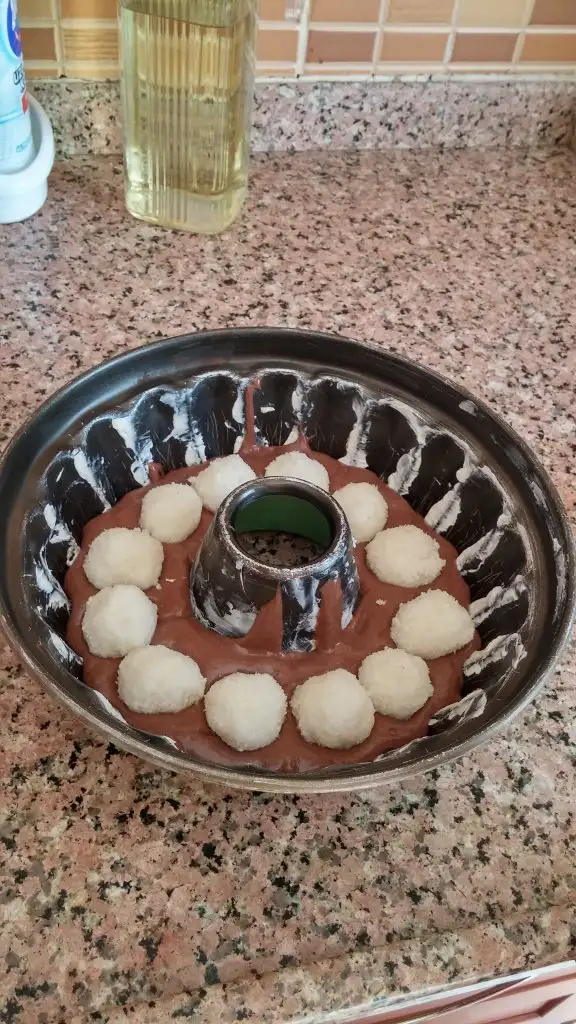 kalıbımızı margarinle yağlıyoruz.kek karışımının yarısını kalıba döküp hazırladığımız topları yan yana diziyoruz.kalan karışımı da üzerine döküyoruz