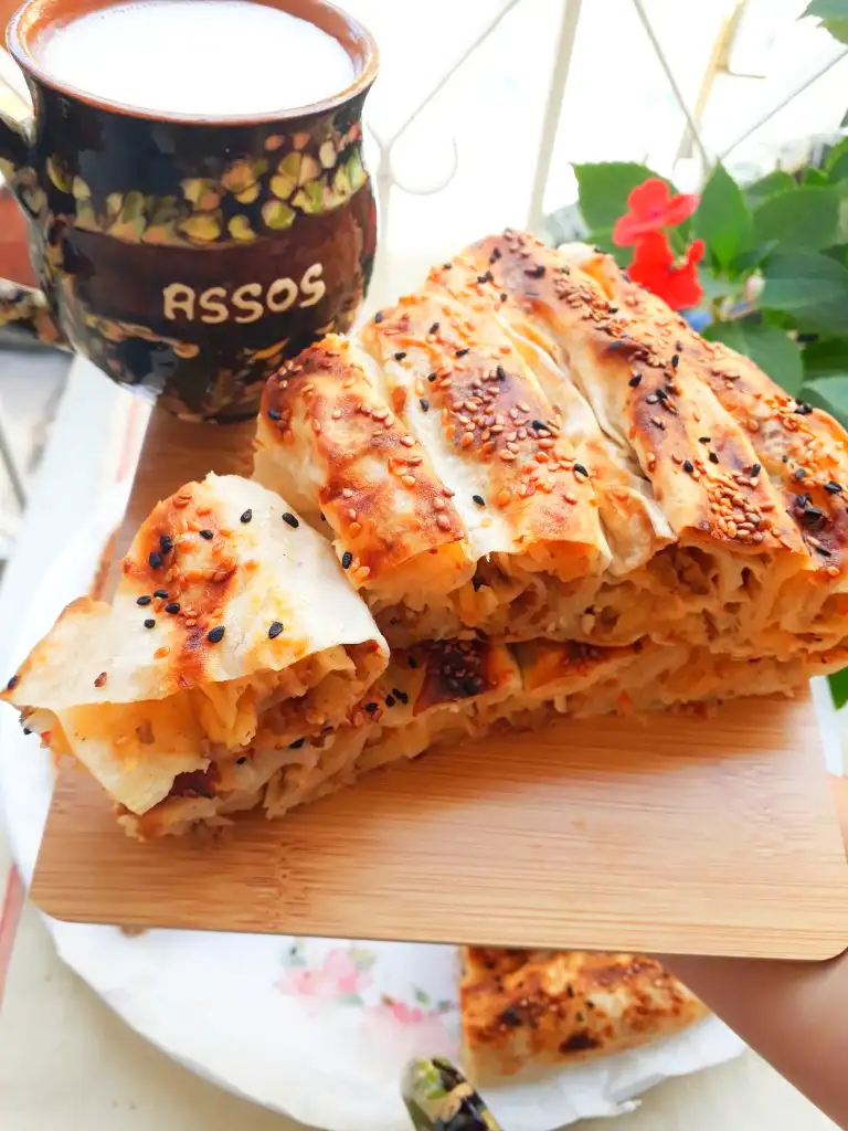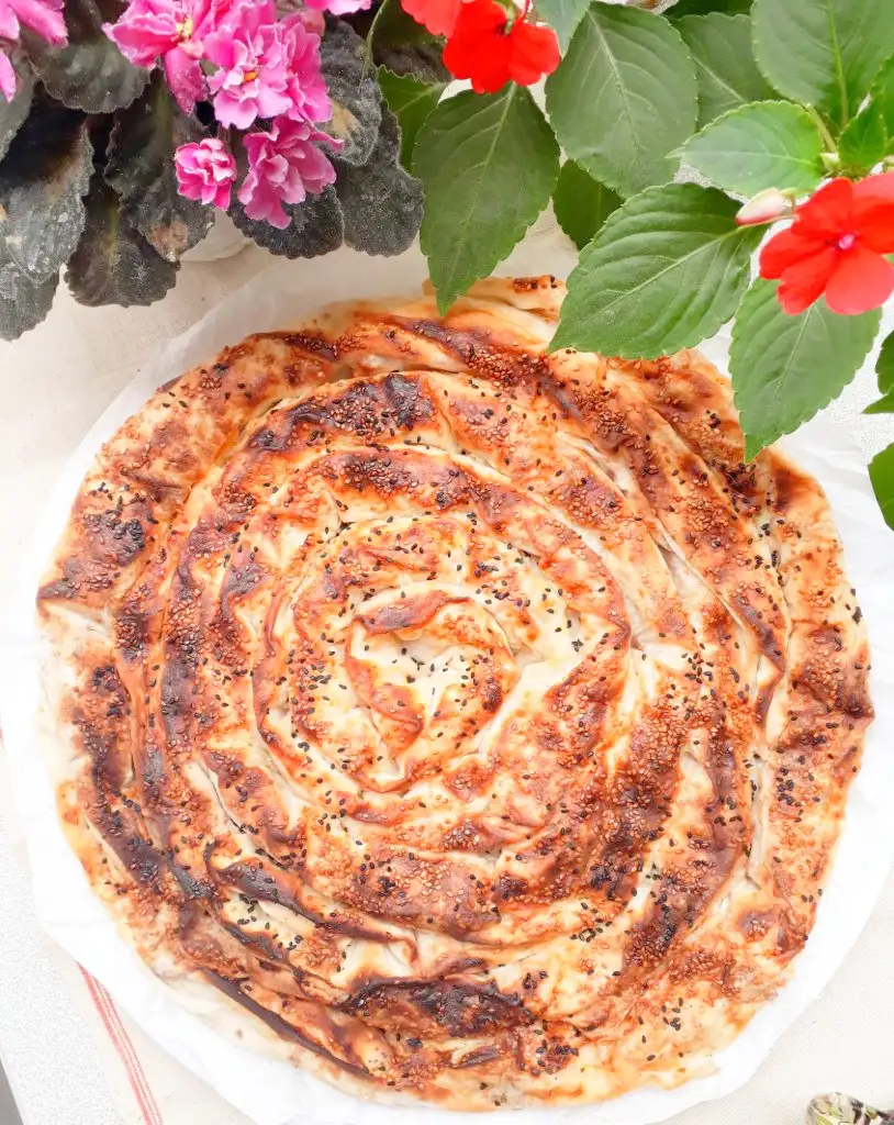tepsinin ortasından başlayarak rulo haline getirdiğimiz yufkaları dolayarak tepsimizi dolduralım. Üzerine kakan sosumuzdan sürelim. Isteğe göre susam ve çörekotu kullanabilirsiniz. Ve önceden ısınmış fırınımızda dikkatli bir şekilde pişirelim.