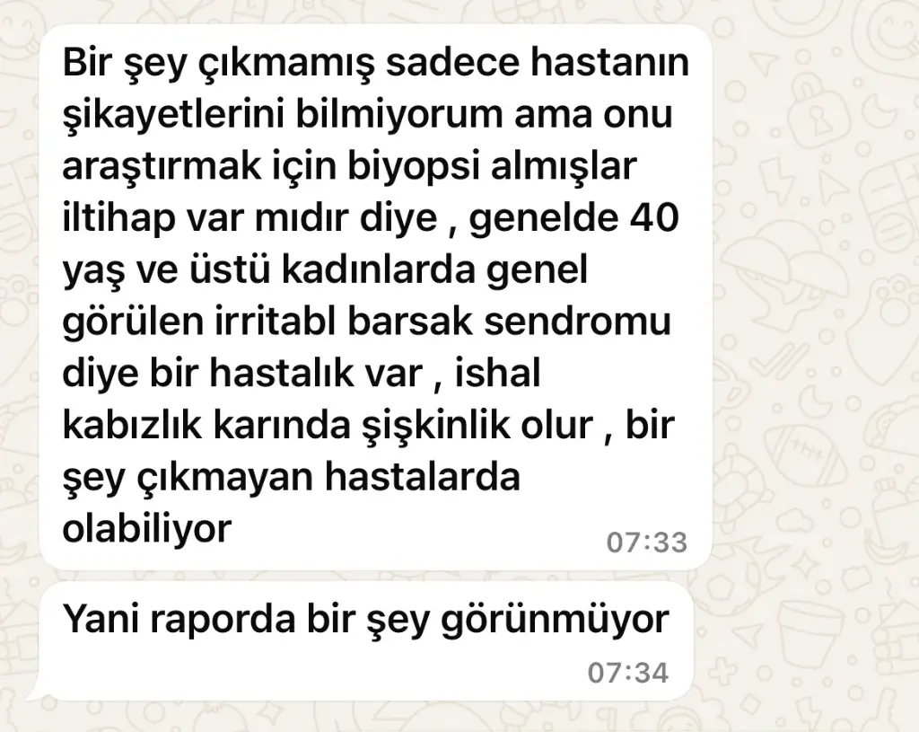 Raporun en alt kısmını yazmayı unutmuşumCanımcım yeğenim cevap verdi unuttum sana yazmayı..Sesli cevap yazdı whatsaptan.Bişey gözükmüyor dedi.Doktora hangi sebeple gitmişse araştırmak için biyopsi almışlar dedi.Bi sorun olduğu için değil yani.İçi rahat olsun raporu temiz çıkmış dedi.İmkan olsa atardım sana sesli mesajını