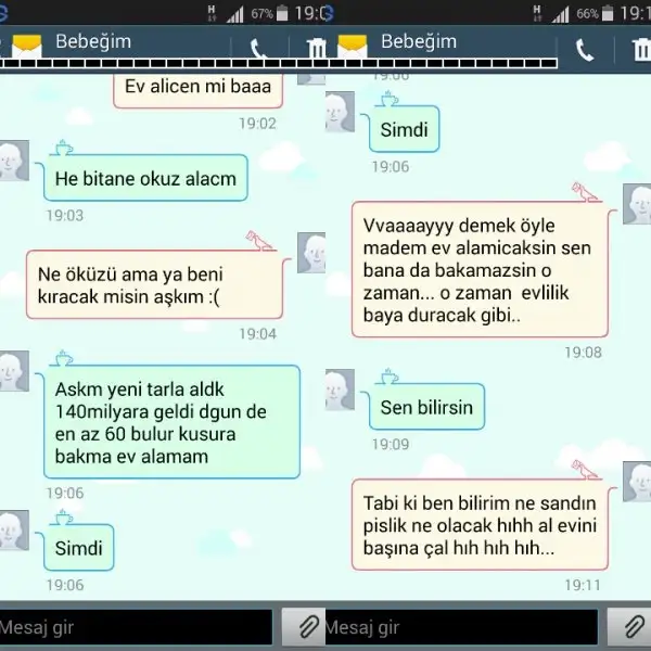 hı hı şaka gibi askerden gelcek evlencez ya dedim ev al evsiz evlilik mi olur o da diyor şimdi alamam tarla aldık borcumu z var dio banane dedim alcaksn dedimbi an dedim şakamı