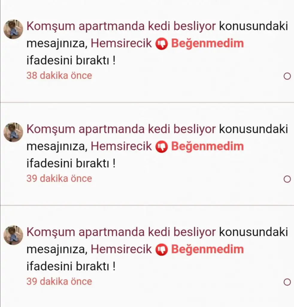 VAlla asıl merhametsiz sizsiniz. Kedileri oraya alıştırıp aç bırakan komşuyu kınayacağınıza , rahatsız olanı kınıyorsunuz. Ben hayvan besleyemem mesela çocuklarım var ve çalışıyorum. Bahçede tavşan var. Ben bakmıyorum. Yeni geldiği günlerde salmıyorduk tanımıyordu çevreyi. Kapıyı tırmaladığını duydum kızıma seslendim oralı olmadı. Çok sinirlendim kabul ettin aç bırakıp günaha giriyorsun diye gönderip beslettim. Sonra kendisi halletmeye başladı. Hayvanları isteyen ve sonra sefil eden burada suçludur, dert yanan değil. Daha da yazmıyorum alıntı yapmayın lütfen