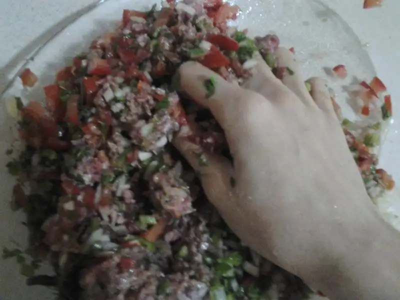 Tuz ve karabiberi de ekleyip harcımızı güzelce yoğuruyoruz..