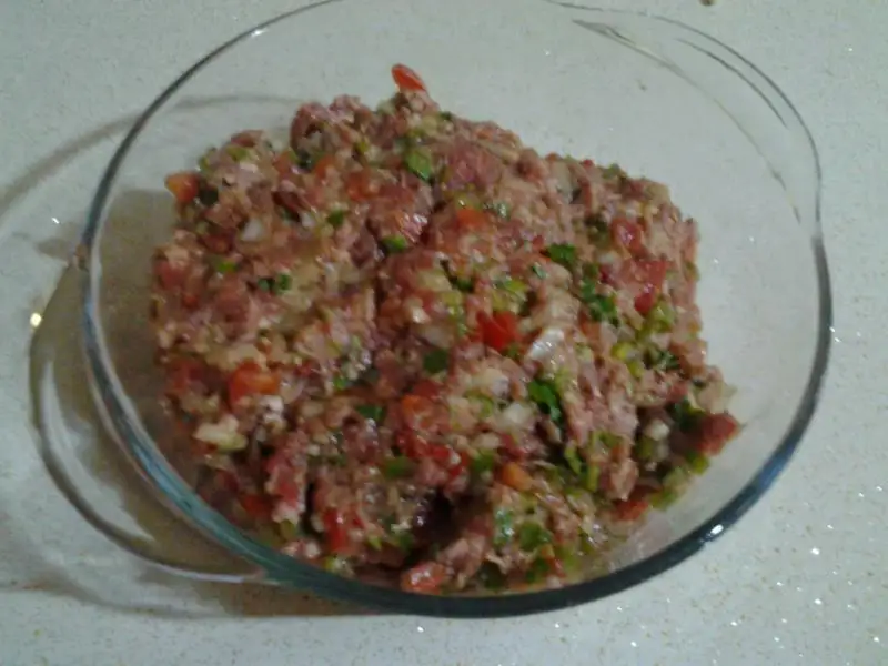 Yarım kilo kıyma, 2 adet soğan, 2 adet biber, 2 adet domates, yarım demet maydonoz, bir tatlı kaşığı tuz ve karabiber..