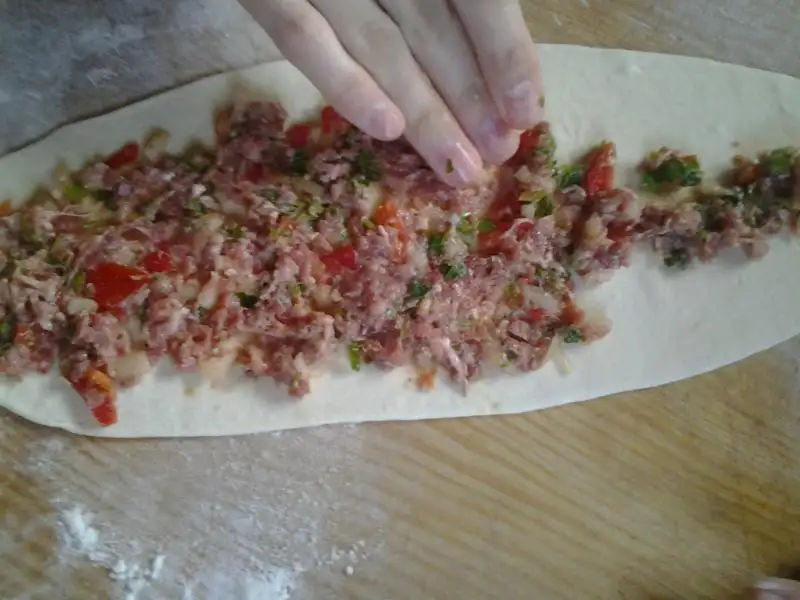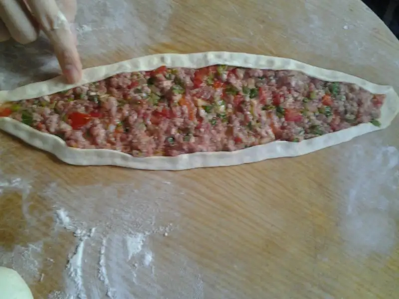 Açtığımız hamura resimdeki gibi iç harcımızdan yeteri kadar koyup, kenarlarını yarım santim içeriye kıvırıyoruz ki fırına koyunca harç dökülmesin diye...