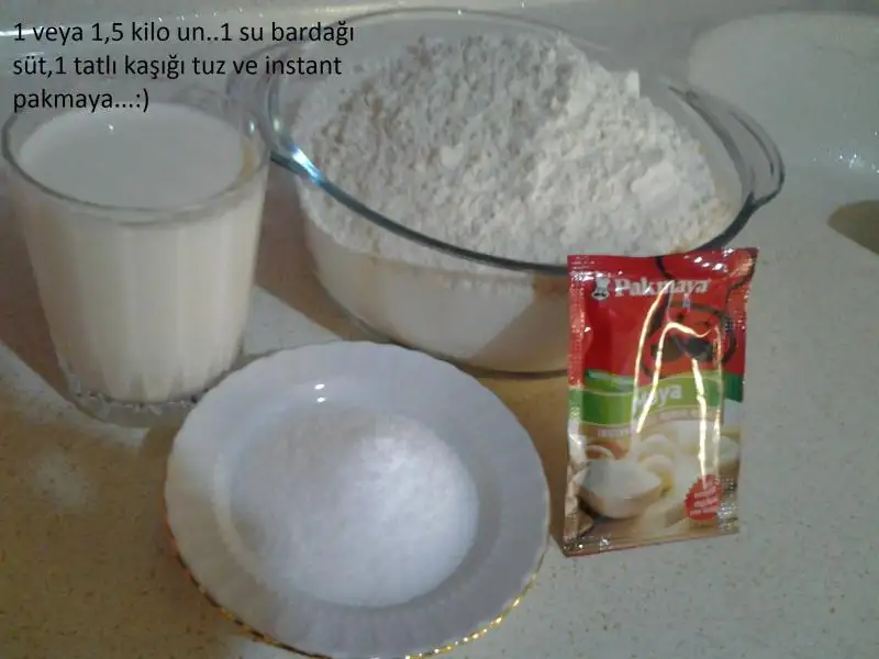 1,5 kilo un, 1 su bardağı süt, bir tatlı kaşığı tuz, bir paket instant pakmaya, ihtiyaç olursa su..