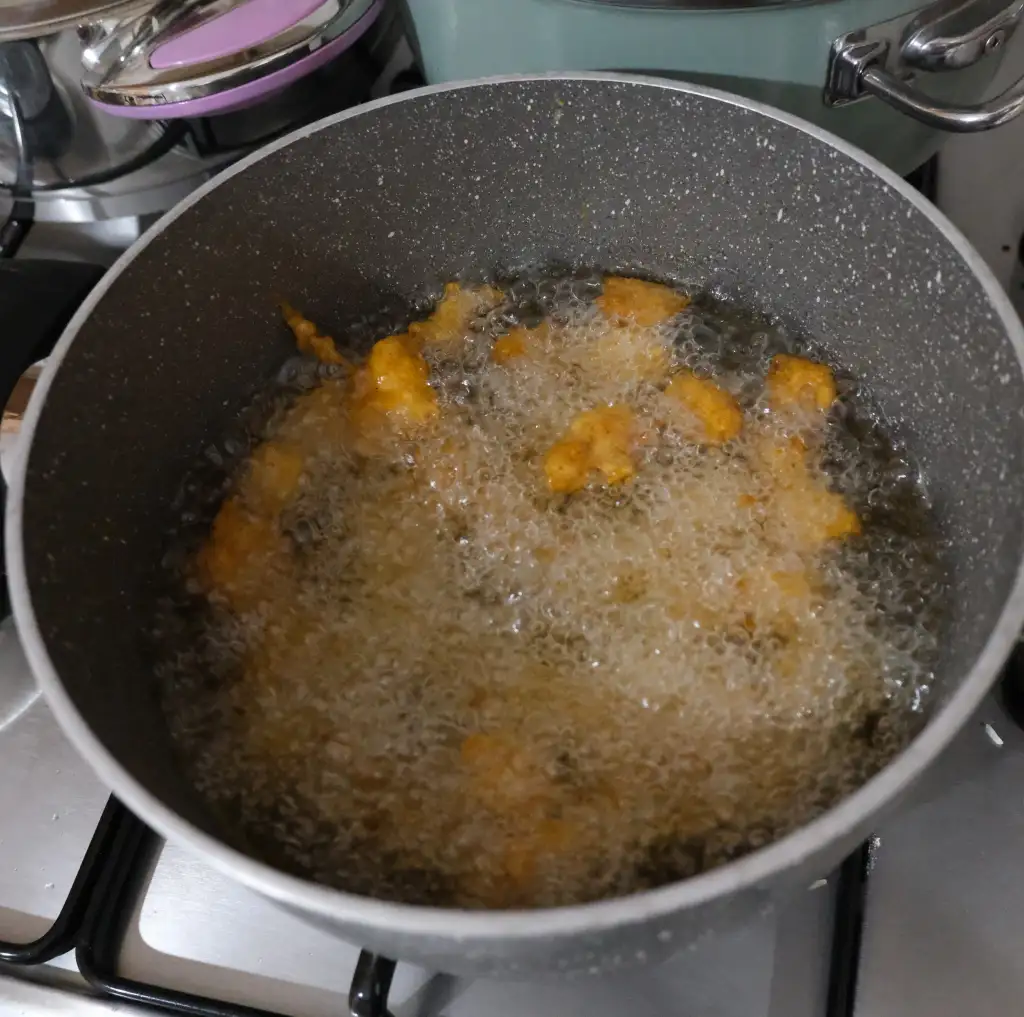Tavukları geniş bir tencerede, bol ve kızgın yağda kızartmamız gerekiyor. Bunun için önce tenceremize bolca sıvıyağ ekliyoruz. Şöyle bir minik çıtırtı sesi gelince; yağ tavukları çağırıyor demektir! Tavukları tek tek içine bırakıyoruz. Burada tek tek eklemek önemli; çünkü tavukların birbirlerine yapışıp sarmaş dolaş olmalarını istemeyiz. Görseldeki altın rengi kıvama geldiklerinde, kevgirle alıp geniş bir tabağa yerleştiriyoruz.
