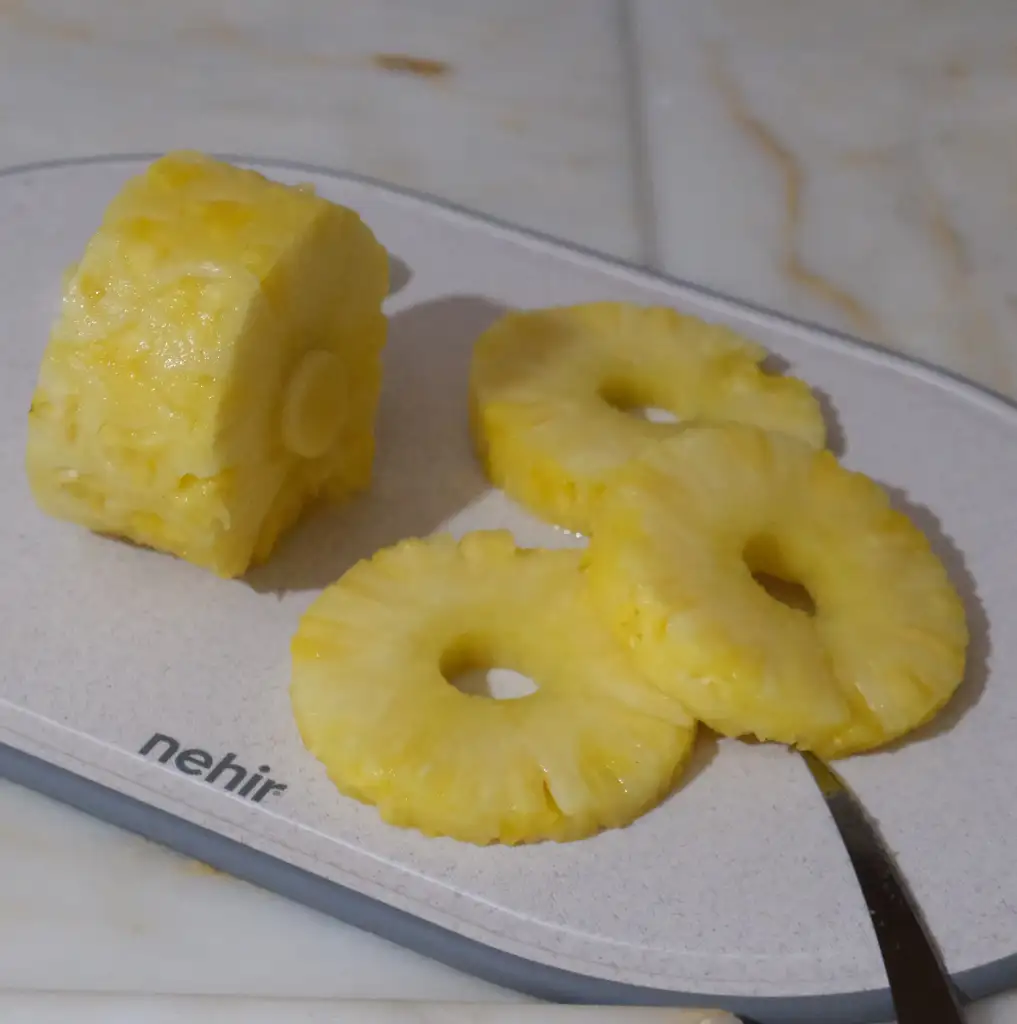 Ananasları dilimledikten sonra ızgara tavasına minicik bir tereyağı ekleyip kızartıyoruz. Benim evde ızgara tavası yoktu, o yüzden farklı bir çözüm buldum. :)