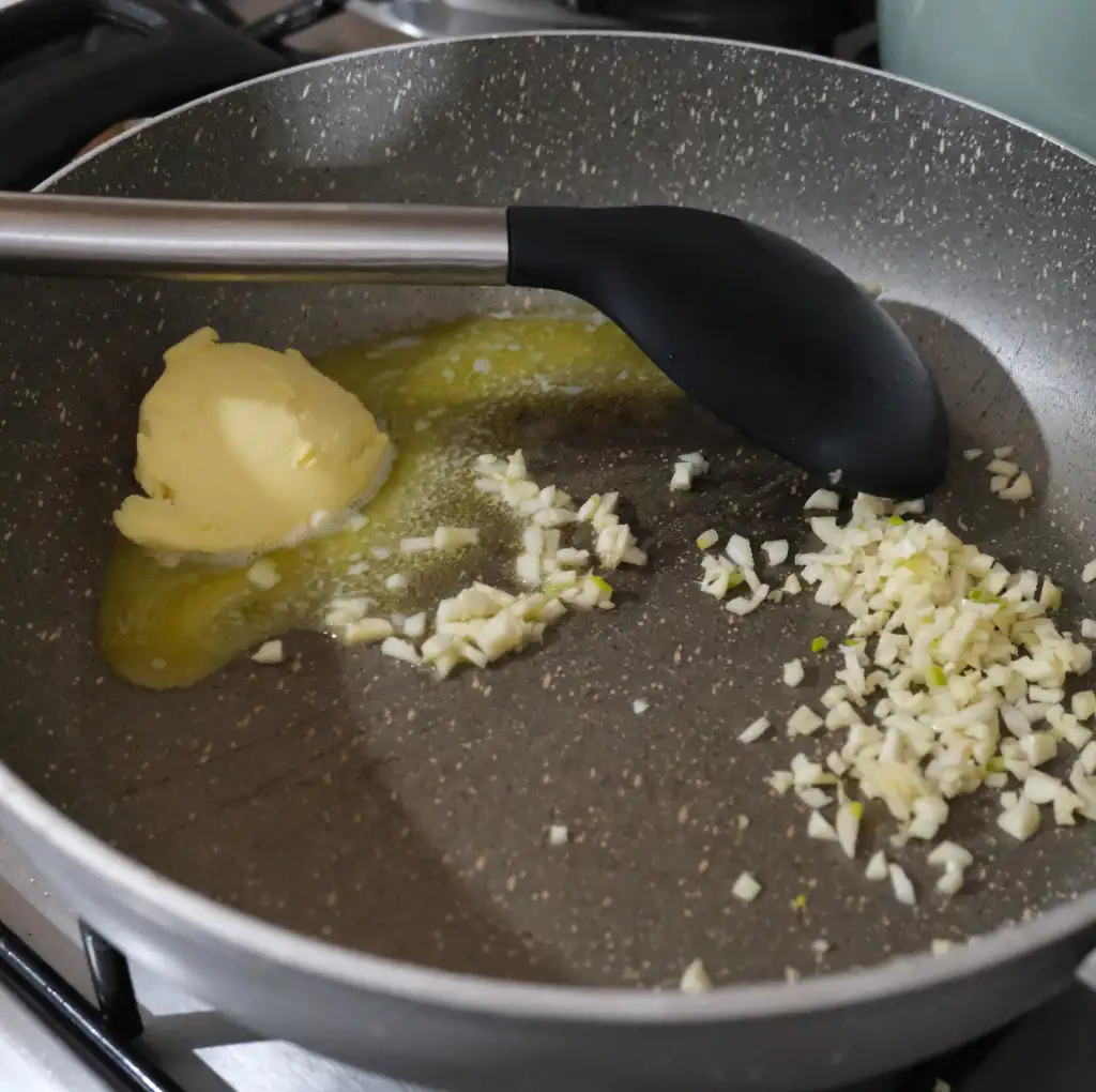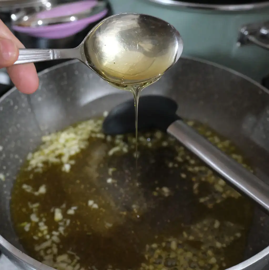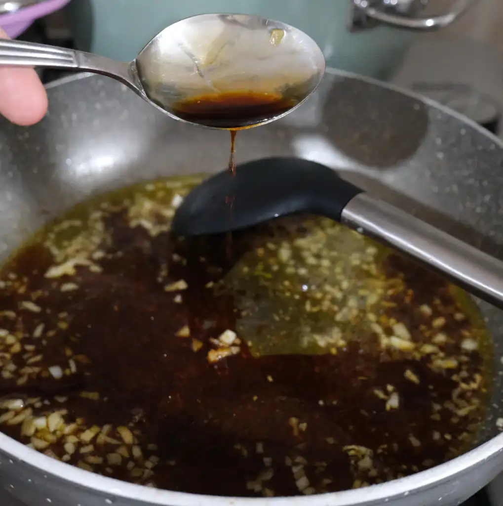 Geniş bir tencere alıyoruz. Ben pilav tenceresi tercih ettim. Tencereye bir yemek kaşığı tereyağı ile küçük küçük doğradığımız sarımsakları ekliyoruz. Yağımızın yanmaması için ateşi fazla açmıyoruz. Tereyağı eriyip hafif hafif fokurdamaya başlayınca 2 yemek kaşığı bal ve 2,5 yemek kaşığı soya sosu ekliyoruz. Birkaç dakika karıştırıyoruz; bu esnada harika bir koku yayılacak!