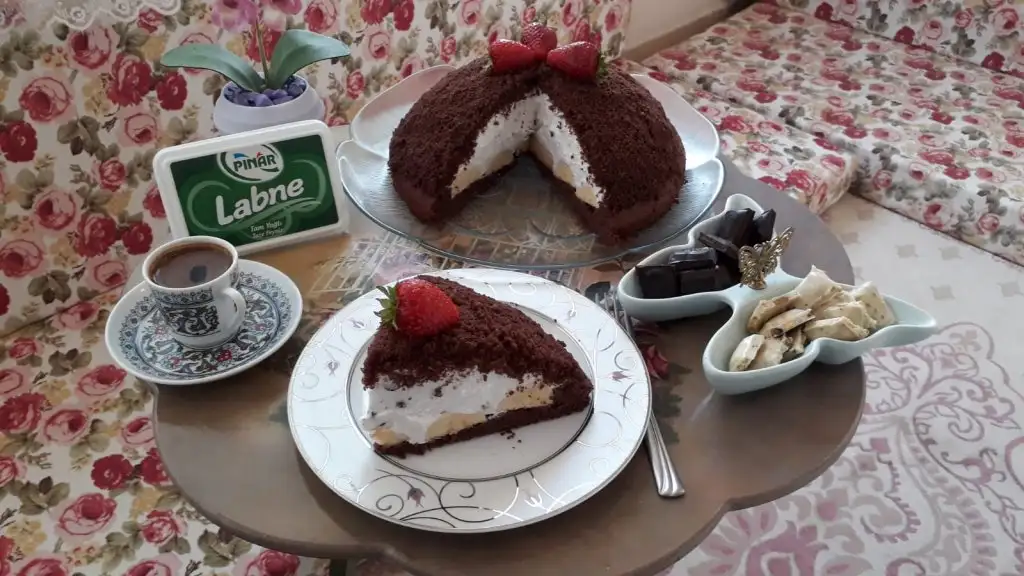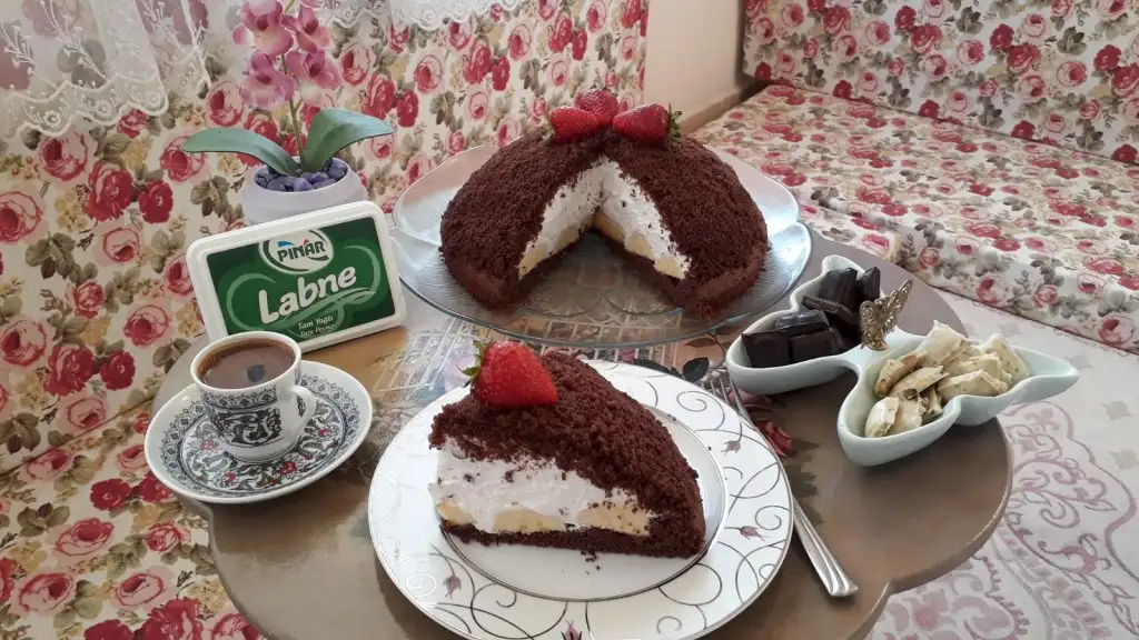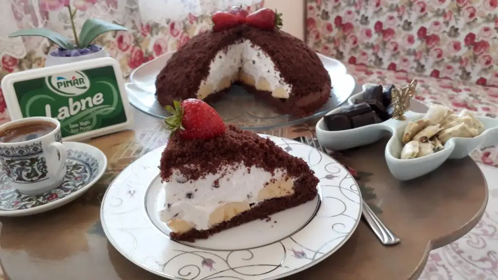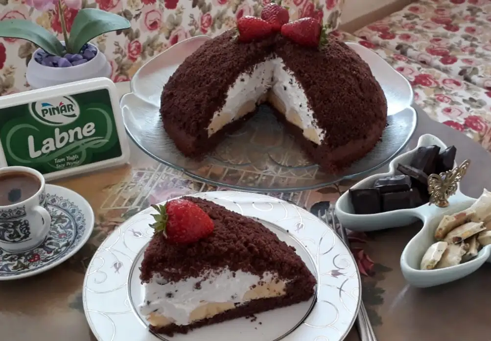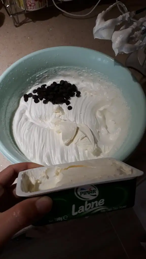 Simdi kremasini hazırlayalım süt ve krem santiyi cirpalim damla çikolata ve labne peyniri ekleyip tekrar cirpalim kremamiz hazır. Muzların üzerine bu harci güzelce yayarak kubbe görünümü verelim.