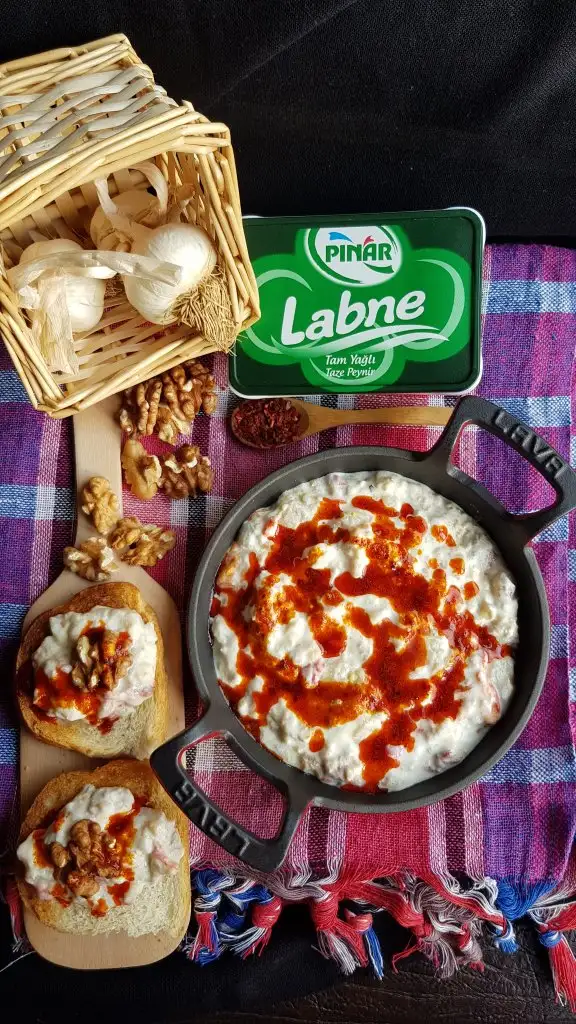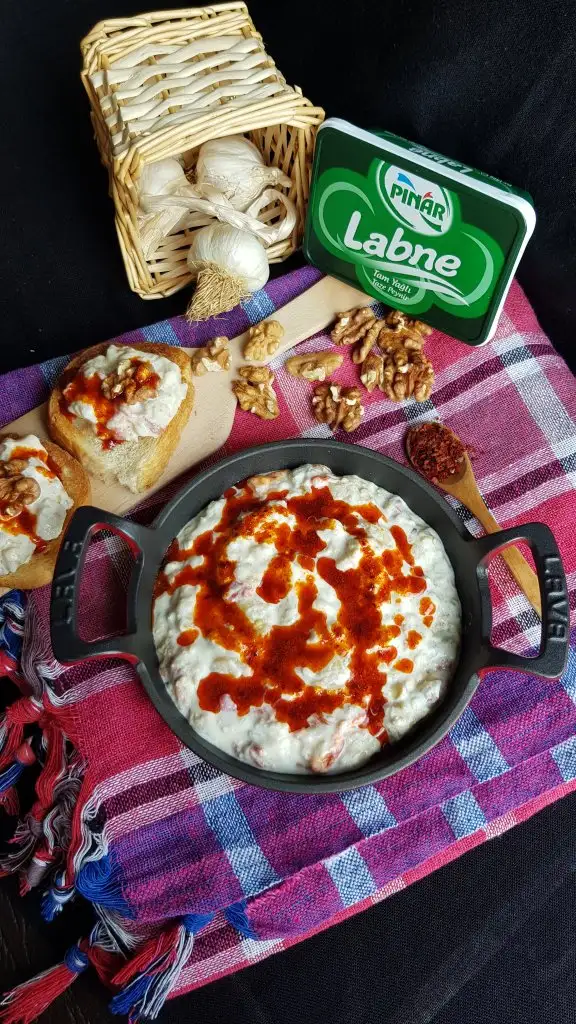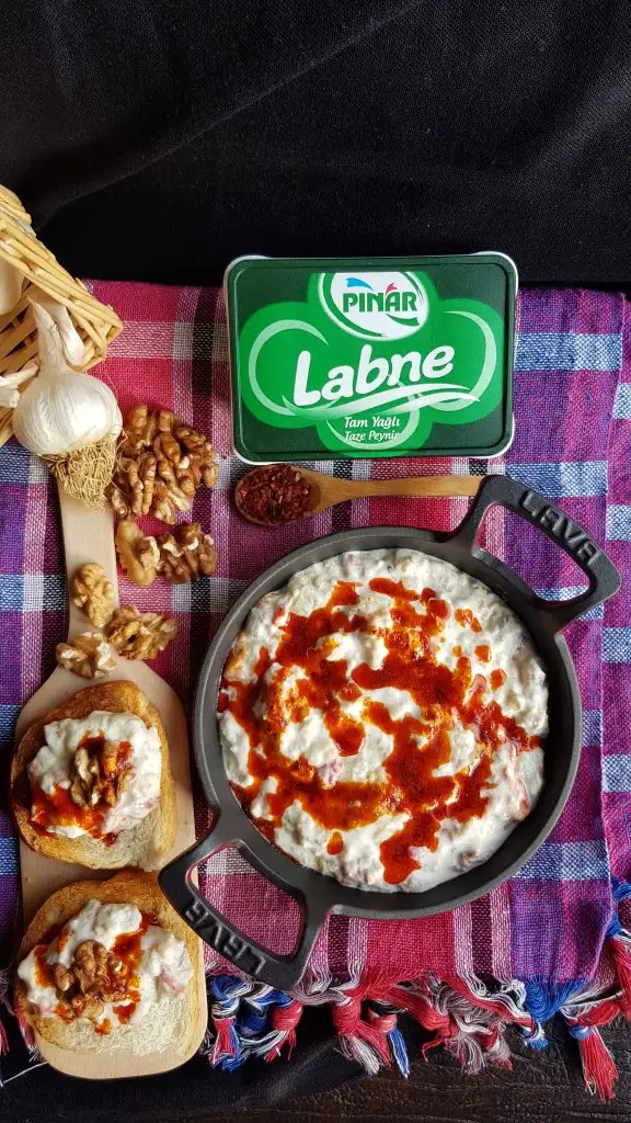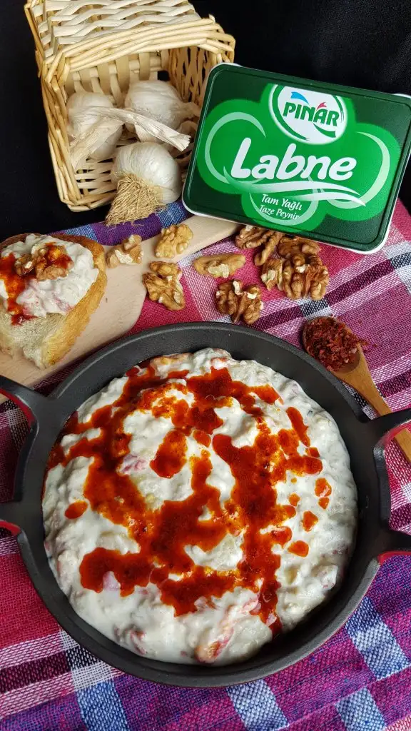 • Uygun bir kap içerisine aldığımız yoğurdun içerisine rendelenmiş sarımsak, labne ve tuzu ekleyerek pürüzsüz bir kıvam alana kadar çırpalım.