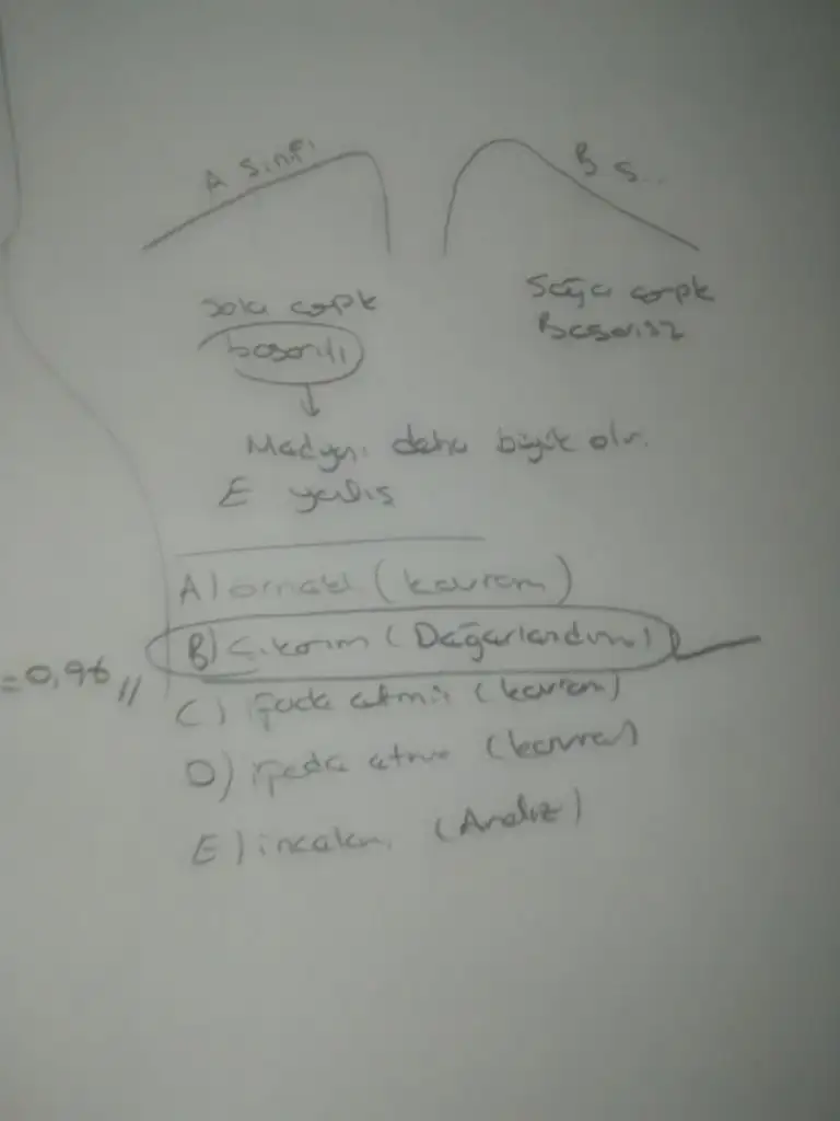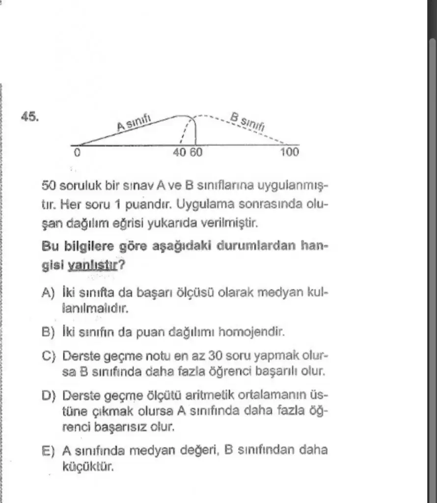 Bencede daha basit ben daha ölçmeyi çalıştım sadece ..ama 45 i anladim D olmasını zaten diğeri sola çarpık o daha başarısız olmalı doğru ben şıkları tamamını okumadim...3. soruya gelecek olursak o ölçme ile ilgili değil galiba daha bitmedi benim konularım malesef yandım Allah video izliyorum yetişirse3-E