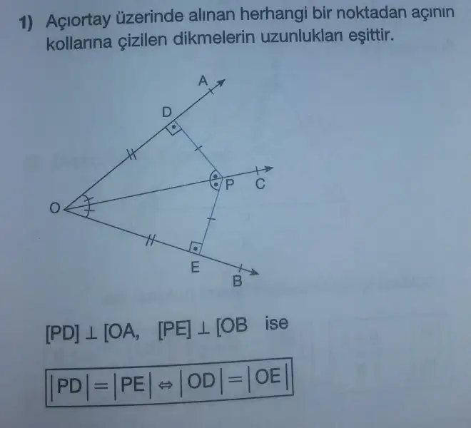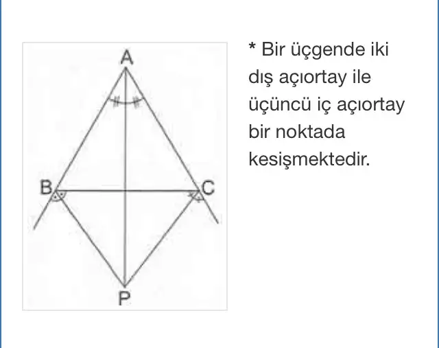Her uzattığın doksan kesmez işte o kural da tam olarak öyle değil. Eğer açıortaydan iki kenara doğru dik indirirsen bu dik uzunlukları eşit oluyor o kurala göre. Orası 90 olabilir; ama senin dediğin kurala göre 90 olduğunu çıkaramıyoruz; ama nereden çıkarıyoruz işte orasını bulamıyorum.dik kestiğini çıkarmadım ki zaten dış açıorta kuralı o, açıortaydan uzatıldığı zaman dik oluyor. Uzattığım kenar doksan derecelik açı oluyor kuraldan ve iki uzunluk eşit oluyor. resim de attım netten kuralı hatta... :)