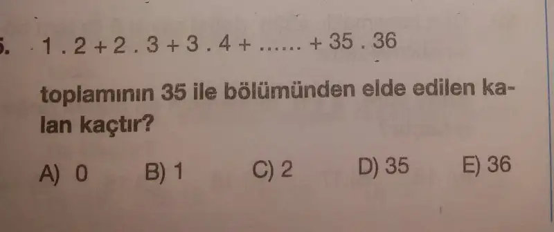 Bu sorunun formülü var; (n).(n+1).(n+2)/3 => n=35.36.37/3 = 35.12.37 çıkar; sonuca baktığında içinde zaten 35 çarpanı olduğu için kalan direkt 0 çıkar; 35 in katı bi sayı zaten.