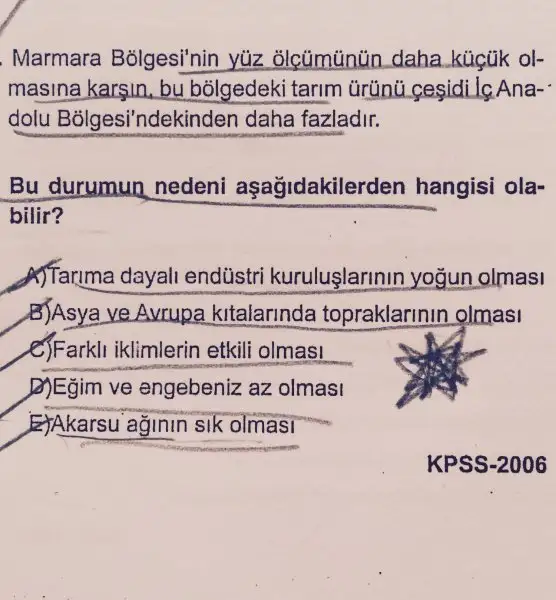 bence iklim, ürün çeşiidini iklim etkiliyor diye hatırlıyorum şöyle ki marmarada akdeniz-karasal-ve karadeniz iklimi mevcut ama iç anadoluda karasal iklim ve bu yüzden bazı ürünler iç anadoluda yetişmez..