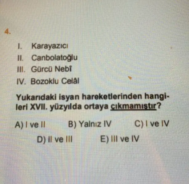 ama bi soru soracaktım; şu soruda cevabı bozoklu celal diyor ama bozoklu celali isyanları 17. yy da değil mi zaten :) Kafam karıştı ya da soruyu anlamadım ne demek istediğini. açıklayabilen olursa sevinirim.