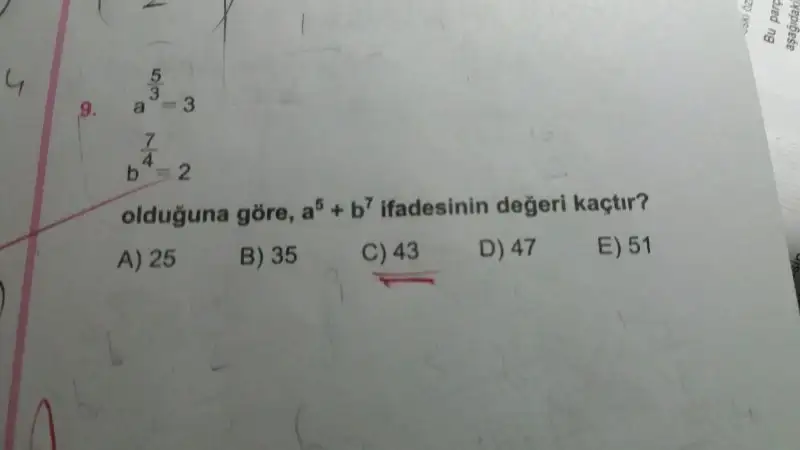 burdan devam edersek : aüssü 5 = 3üssü3 ve b üssü 7= 2 üssü 4 olur bu da 16+27 =43