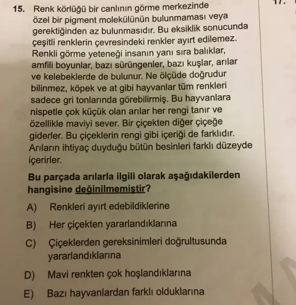 Mesela bu soru.. cevap b, ben c dedim.. tamam b yanlış biliyorum ama c nasıl doğru oluyor, c'ye nerede değinmiş ki.. çiçeklerden gereksinimleri doğrultusunda yararlandıklarına dair ben bir şey göremiyorumson cümleyi gerekçe göstermiş ama son cümleden o anlamı çıkarmak bence çok saçma:/