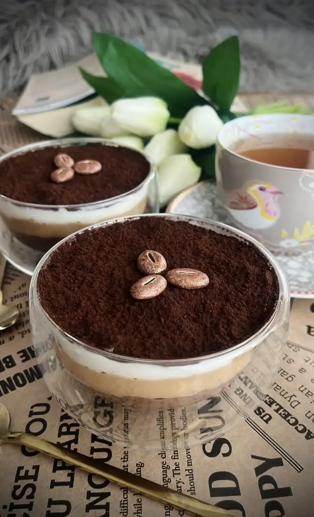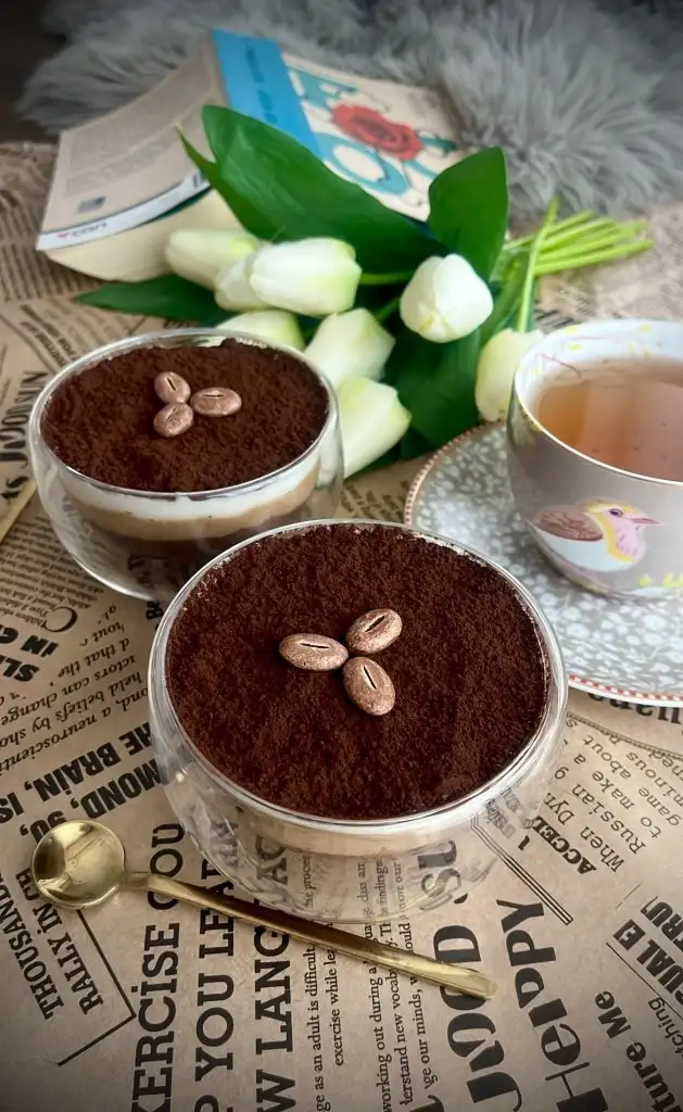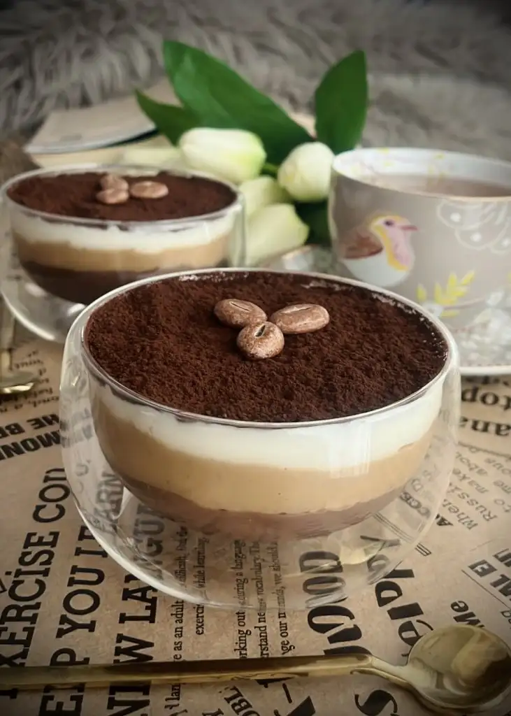 Biraz donduktan sonra kahveli olan muhallebiyi ardından çikolatalı olan muhallebiyi paylaştırıp en üstüne kakao serpiyoruz.