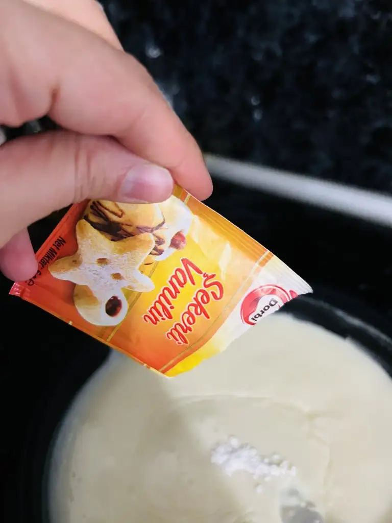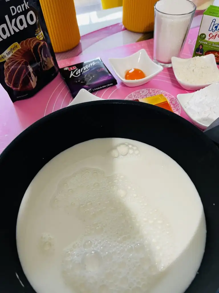 Çırpma teli ile çırparak orta ateşte pişiriyoruz.Kıvam akınca ocağı kapatıp vanilin ekleyip tekrar karıştırıyoruz.