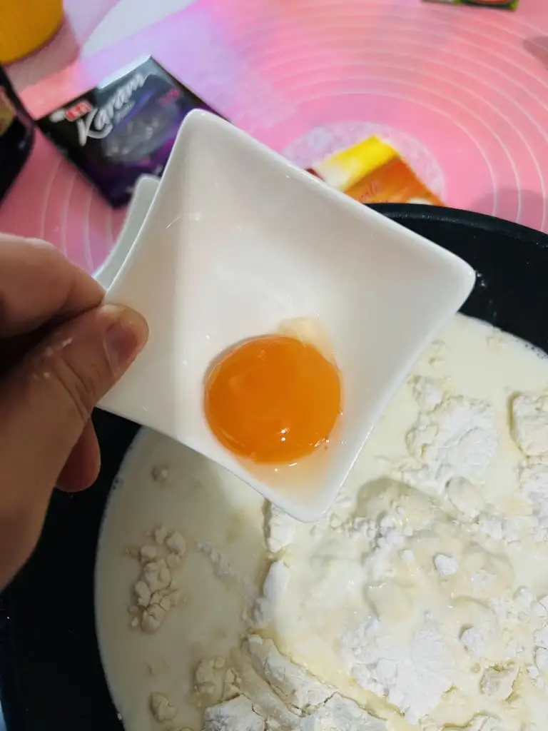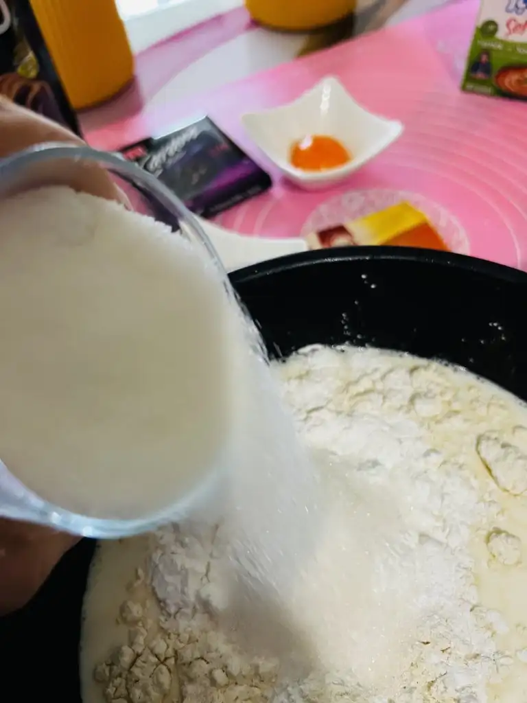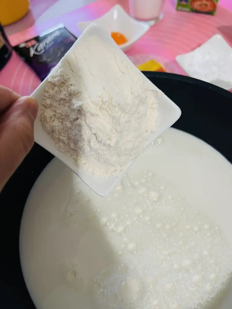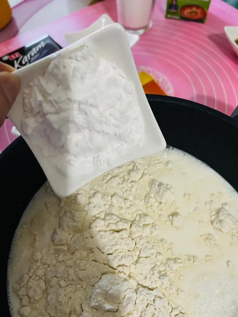 Süt,şeker,yumurta sarısı,nişasta ve unu aynı anda tencereye alıyoruz.