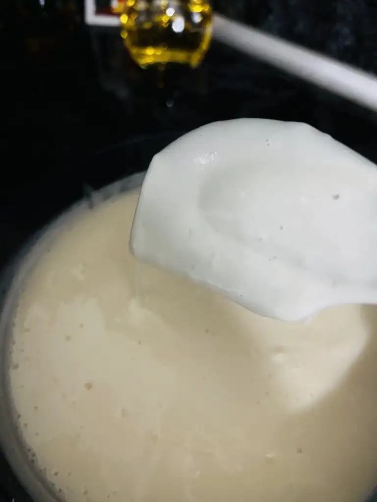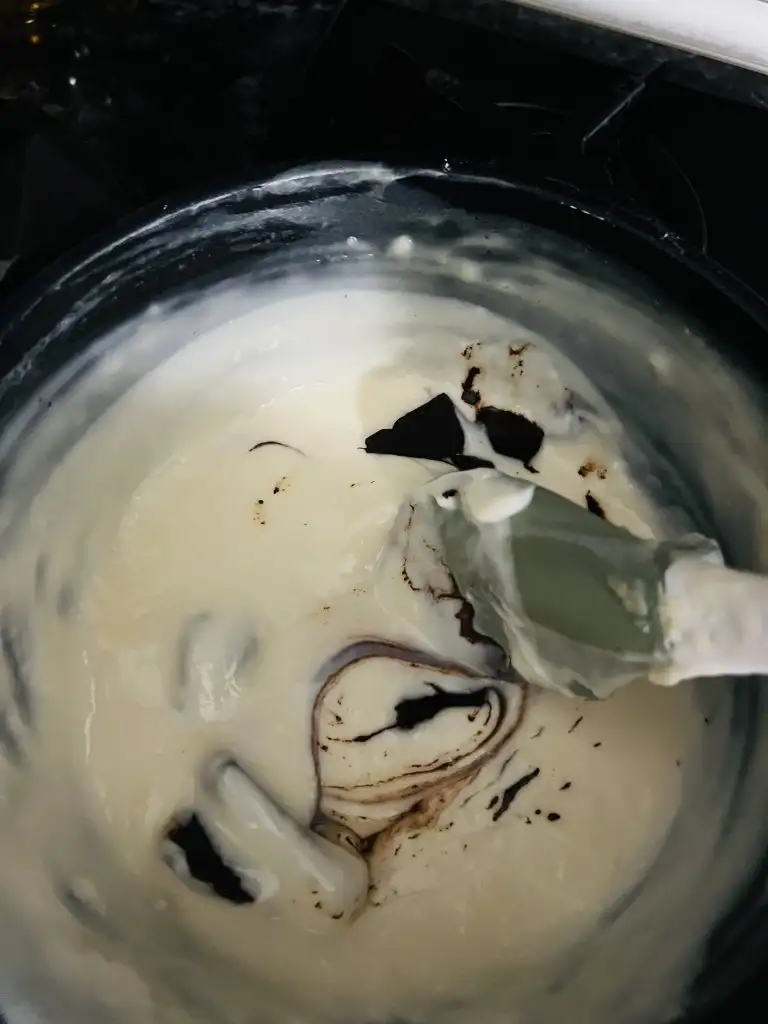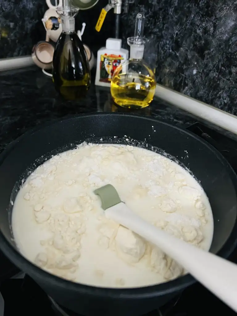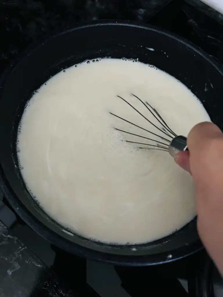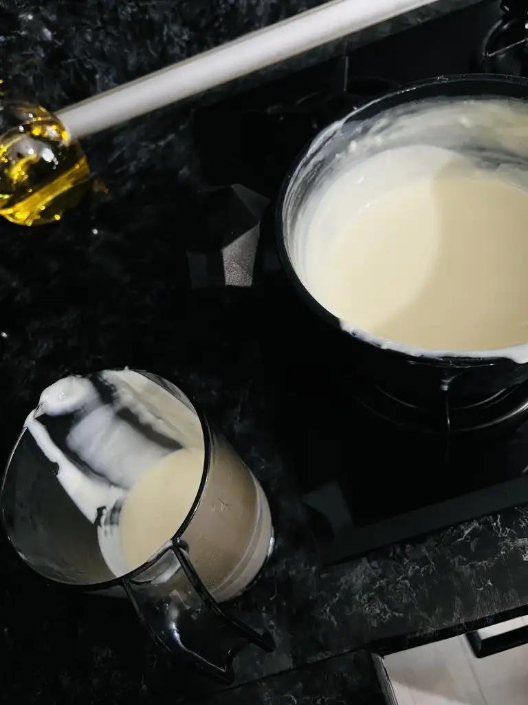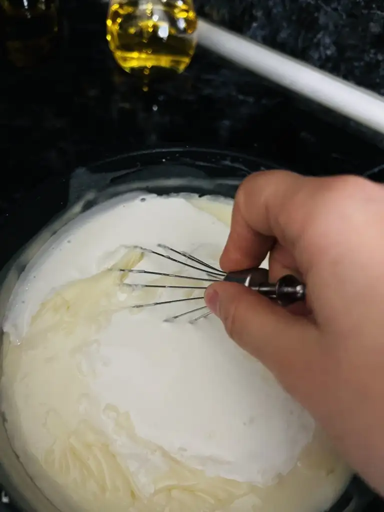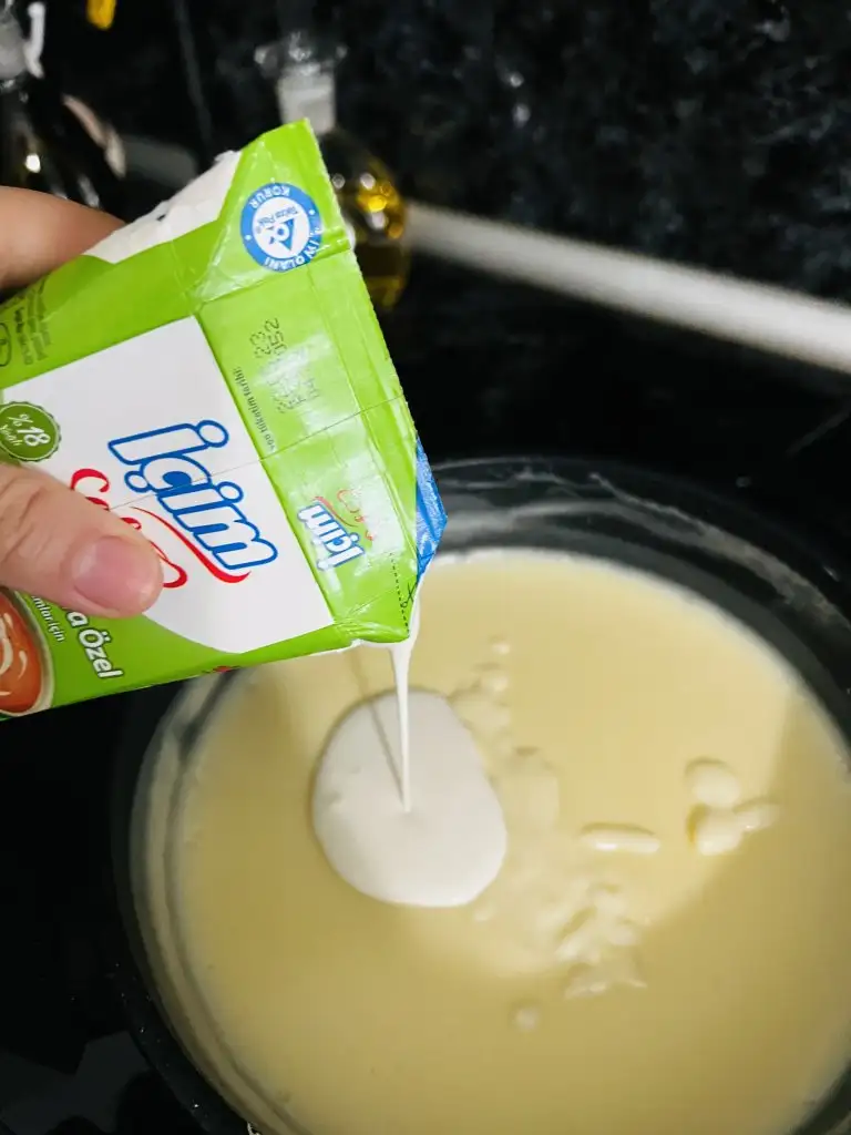 Ocağı kapattıktan 4-5 dk sonra muhallebimize kremamızı ekleyip tekrar karıştırıyoruz.