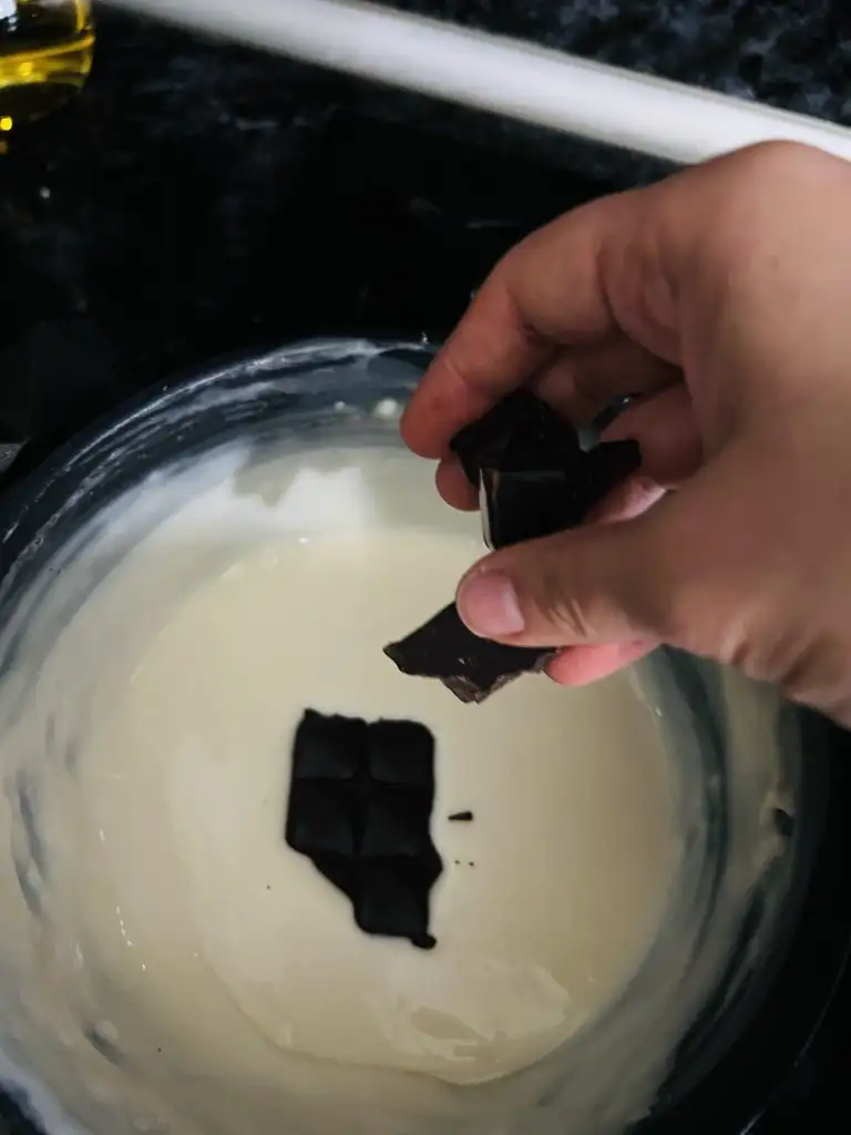 Diğer yarısına ise bitter çikolatamızı ekleyip karıştırıyoruz. Kaselerimizde bulunan sade muhallebicinin üzerine ilk granül kahveli muhallebimizi onun üzerine ise bitter çikolatalı muhallebimizi paylaştırıyoruz.