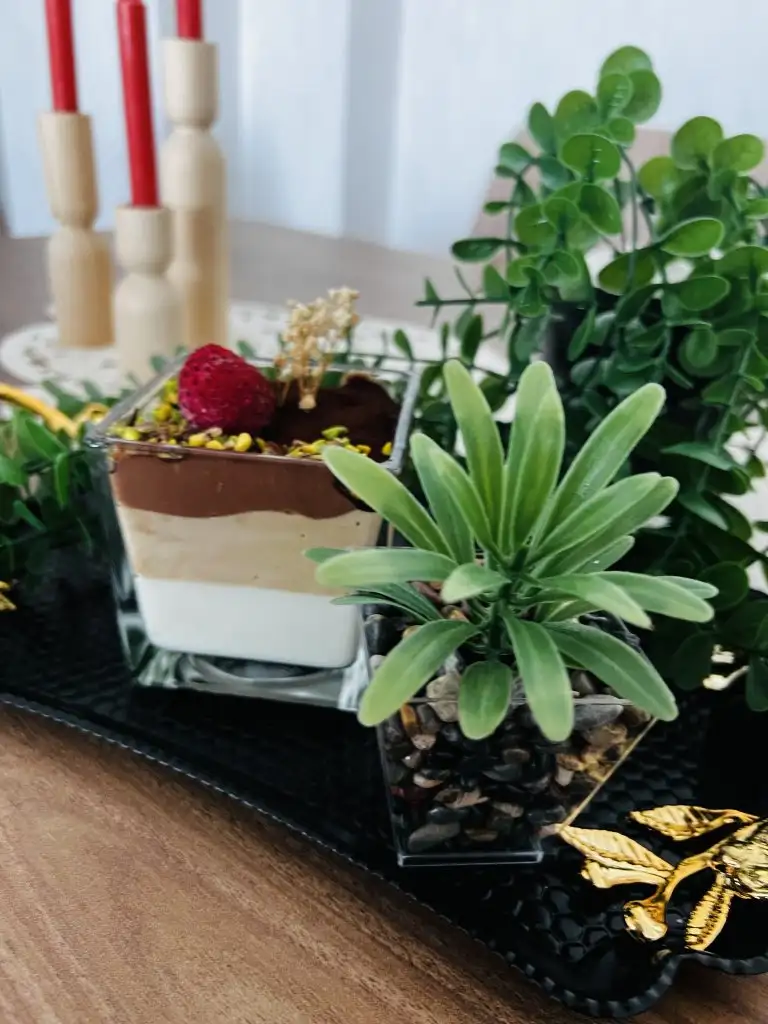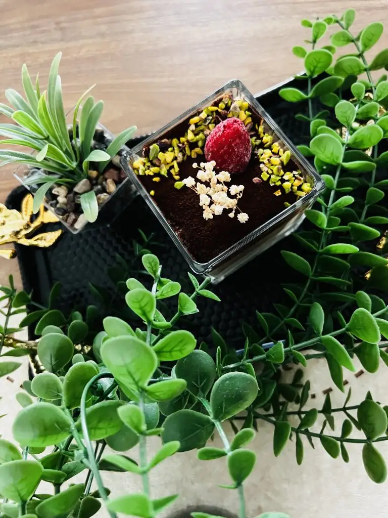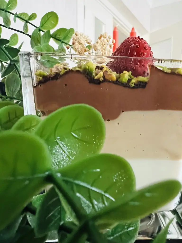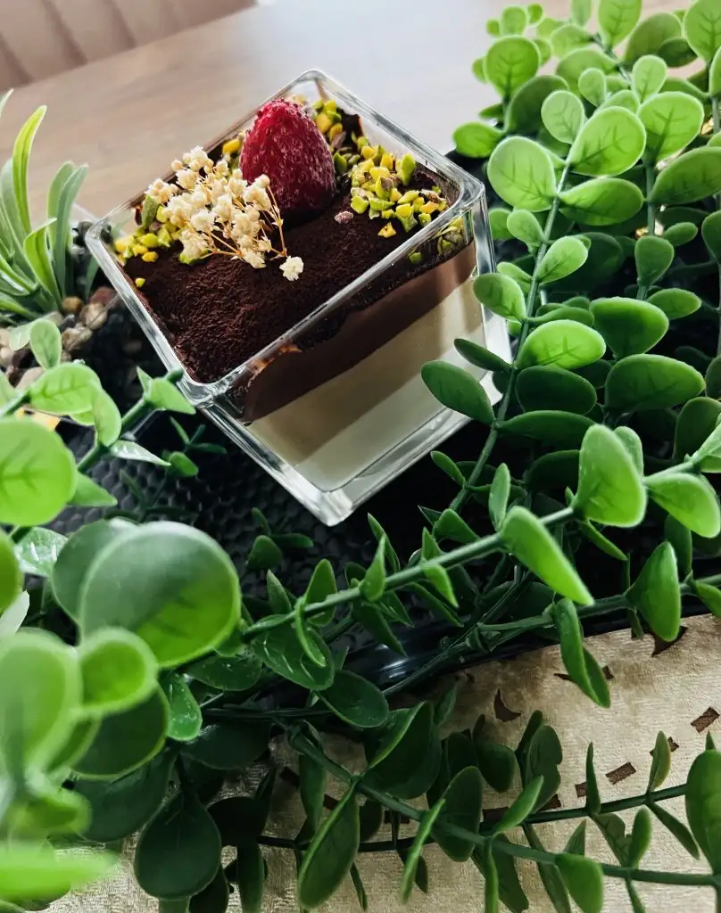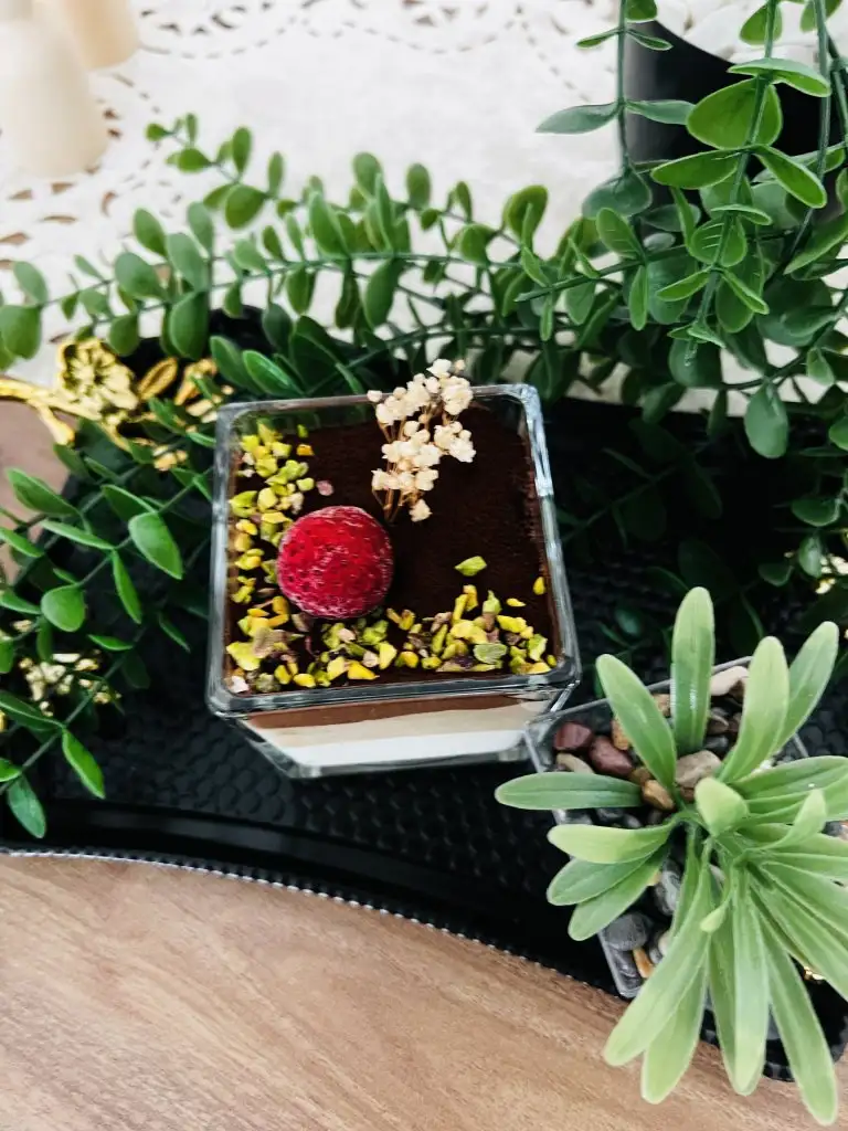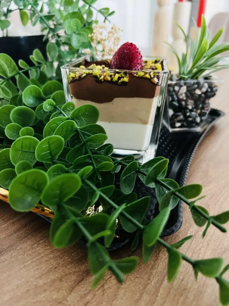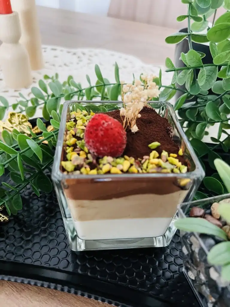 Kaselerimizin en üstüne kakao serpiştiriyoruz.Antep fıstığı ve çilek ile süslüyoruz.
