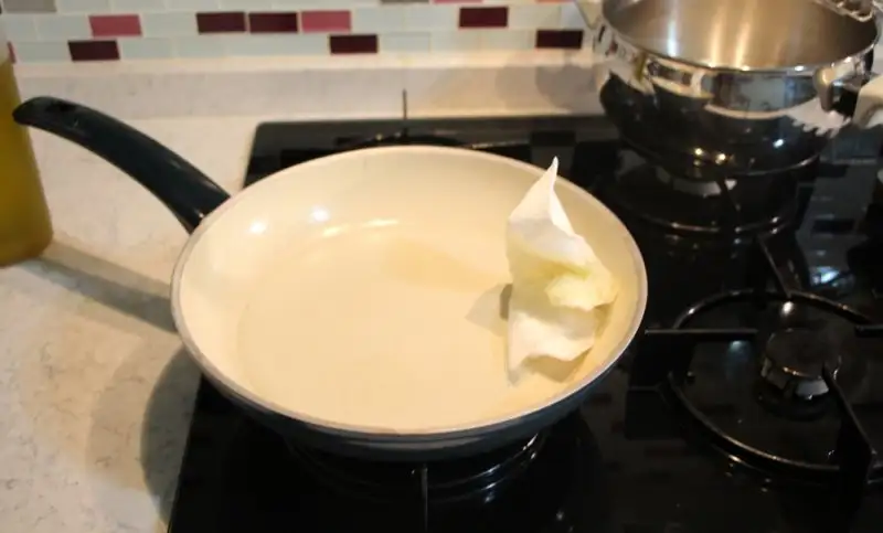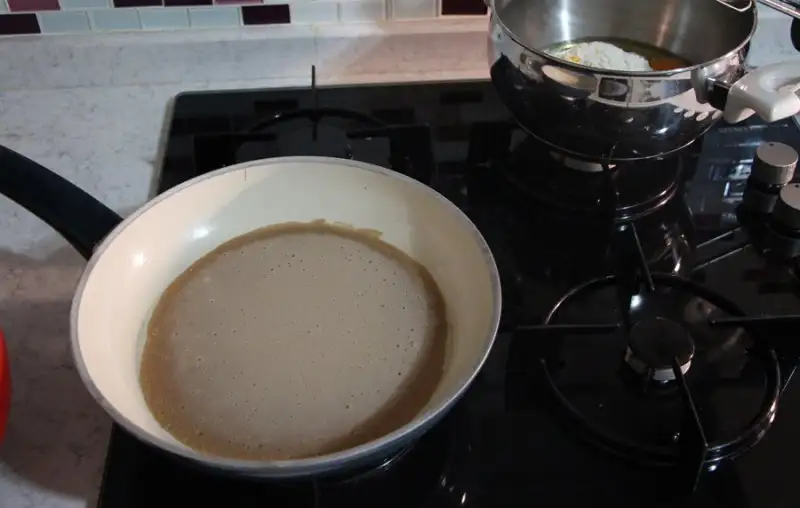 Devam edelim. Bir kepçe yardımı ile, hazırladığımız krep hamurumuzu, işte bildiğimiz krep mantığında, yağladığımız yapışmaz büyük bir tavaya döküyor ve tek tek kısık ateşte pişiriyoruz. Şimdi yağ kısmında bir püfümüz var. Kreplerimiz yapışır mı yapışmaz mı, yok krep olmadı bu kızartma oldu, yağ çekti vırt zırt olayı yaşamamak için, yağı tavaya değil, temiz bir kağıt peçeteye alıyor ve tavayı bu peçete yardımı ile yağlıyoruz. Bu kreplerimizin tam ayarında pişmesi için yardımcı olacak. Dileğe göre kalın, dileğe göre ince dökebilirsiniz, ince olursa rulo haline getirmesi daha kolay olur tabiysi, bir de haddinden fazla kalın yaparsanız çevirirken dağılma ihtimali de o oranda artacak. (Ah tavadaki atışlarımı eklesem kesin birinciyim de, neyse)