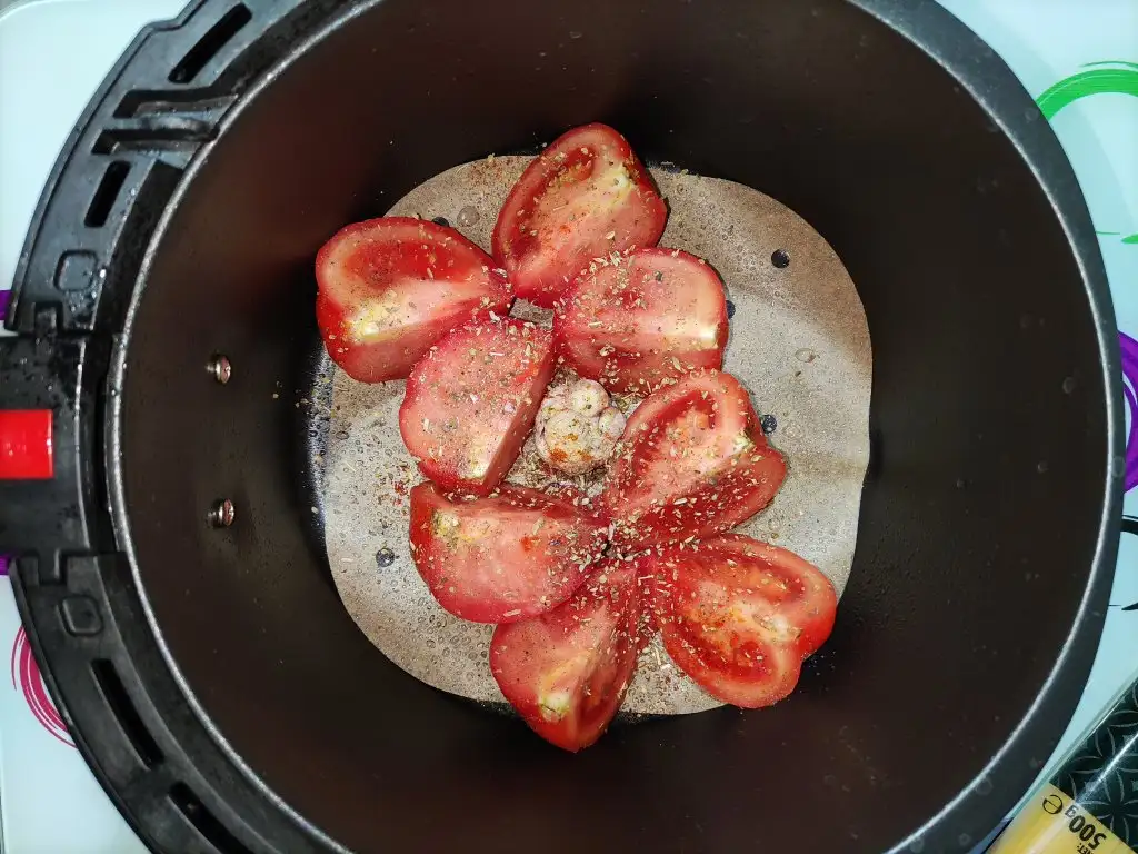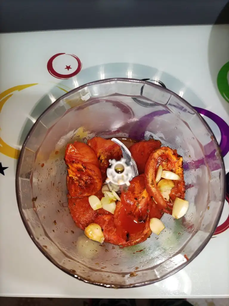 Öncelikle domatesleri yıkayıp 4 e bölelim. Sarımsağı üstten derin şekilde keselim. Domates ve sarımsağı yağlayıp baharatları atalım. Ben airfryer de közledim fırında da yapabilirsiniz. Közlenmiş domates ve sarımsağın kabuklarını soyup robotta çekiyoruz.