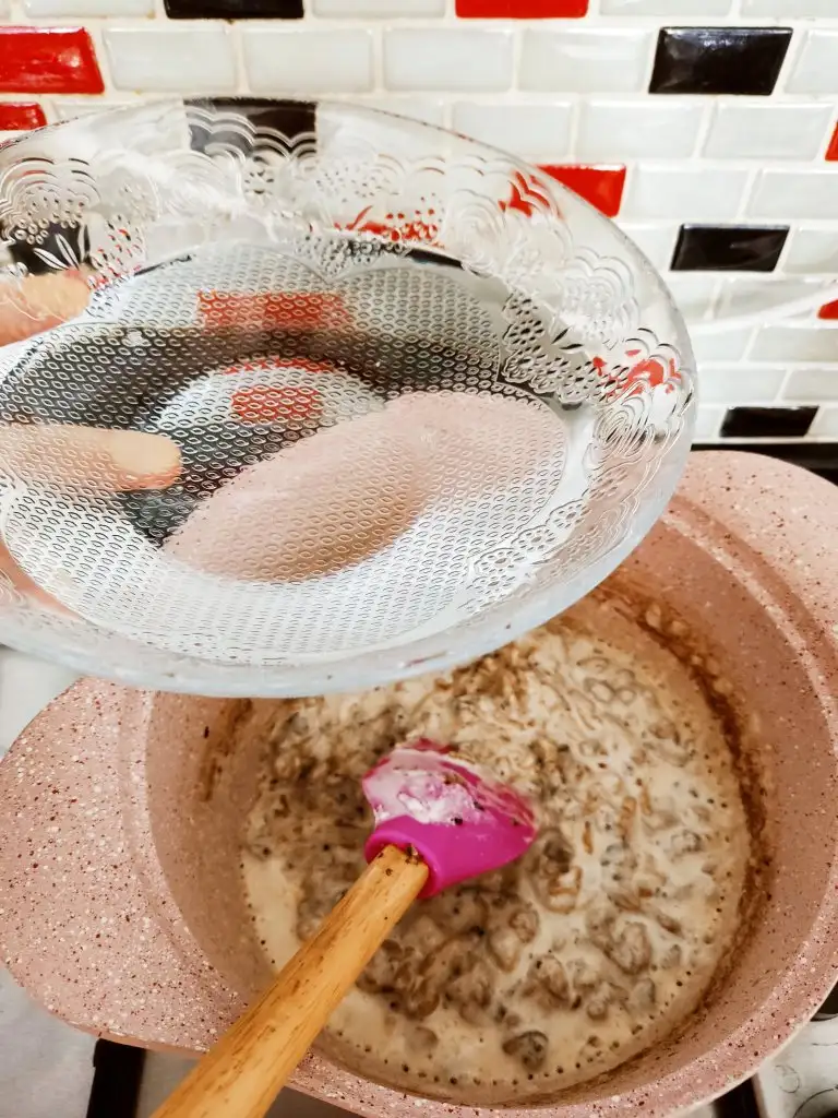 Ardından sıvı krema ilave edip üstüne yeterli miktarda suyu koyup kaynayıncaya kadar karıştırıyoruz.
